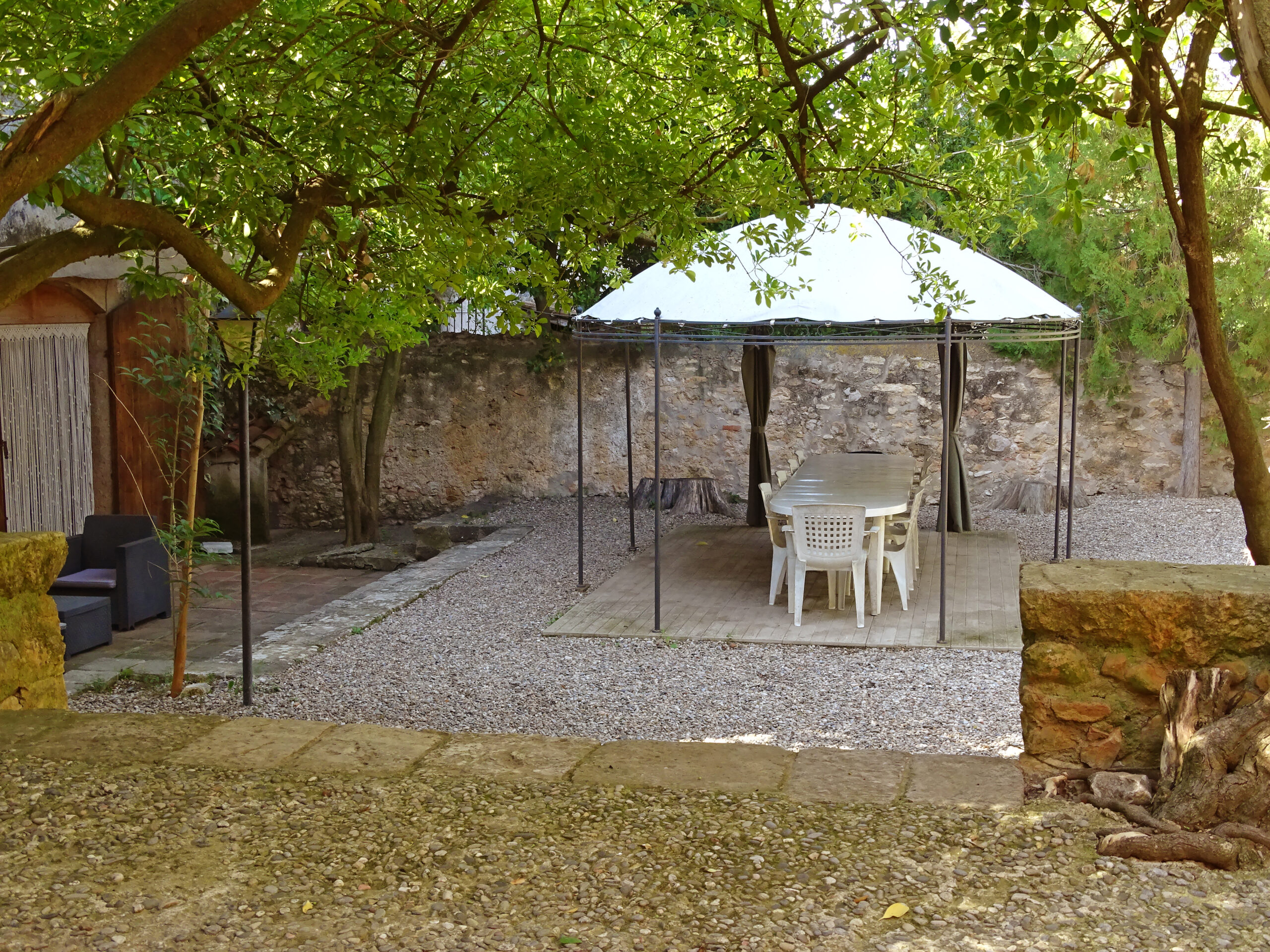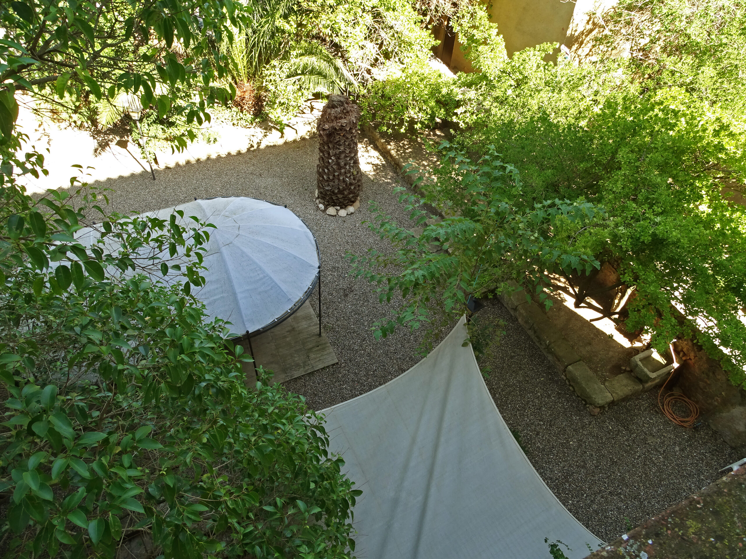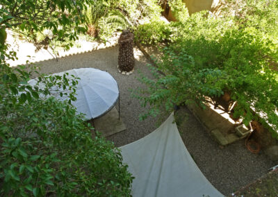 La casa cuenta con una zona verde de unos 3.000 m2, formada por el jardín de la abadía y los antiguos huertos de «la Rambla», «la Mare de Déu» y «el Llarg». La vegetación incluye especies arbóreas como el laurel (Laurus nobilis), el ciprés (Cupressus sempervirens), el saúco (Sambucus nigra) y el nogal (Juglans regia), entre otros. Una balsa y un surtidor evocan los dos usos históricos de este espacio: huerto y jardín. Esta área permite disfrutar de largos y tranquilos paseos rodeados de naturaleza, sin salir de la casa, mientras se admiran las antiguas piedras del monasterio.