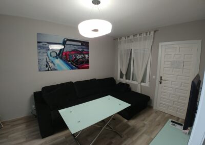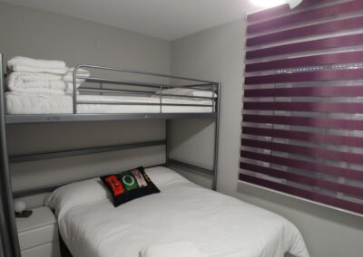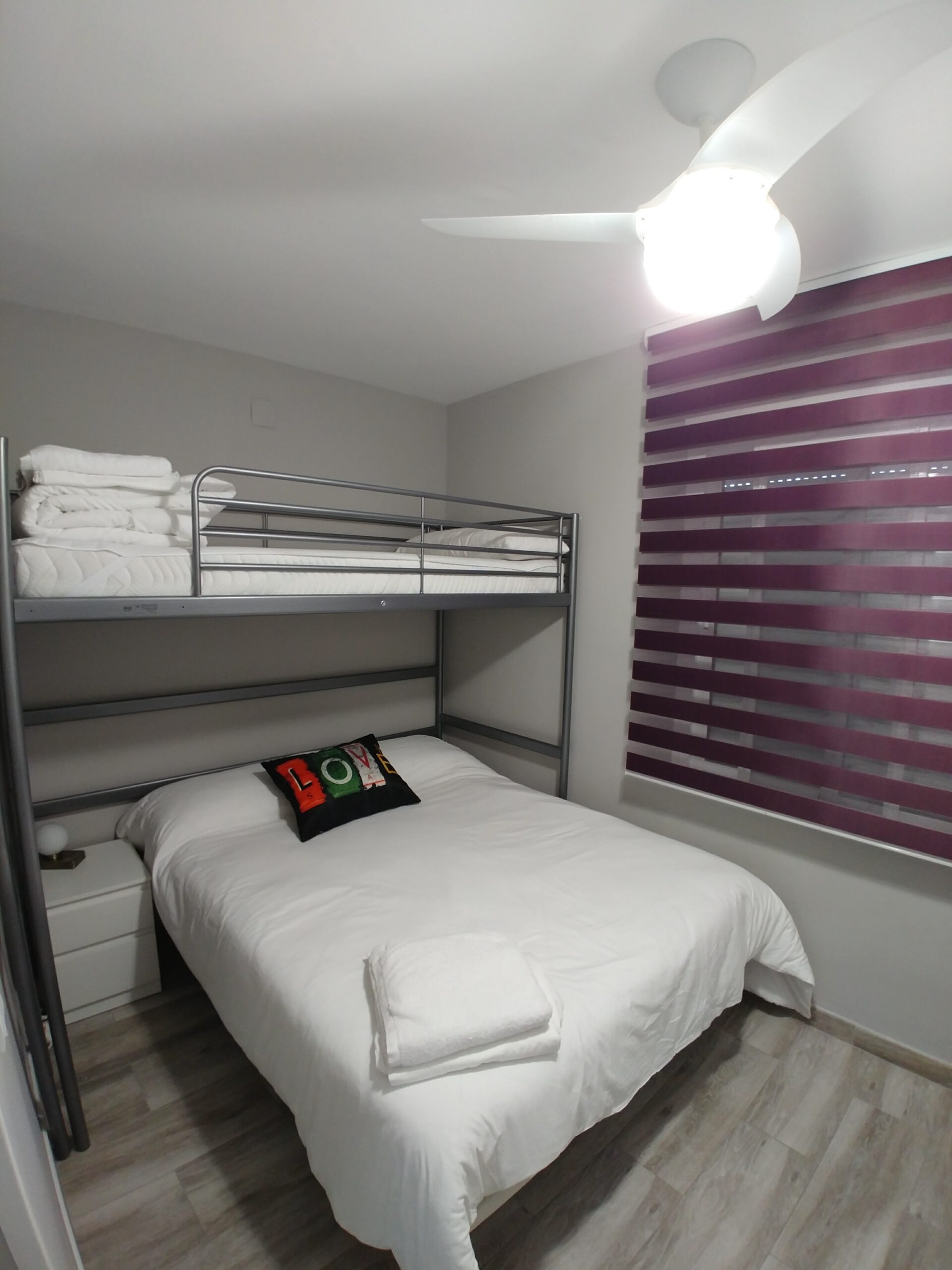 Con 45 metros cuadrados distribuidos en salón con TV de 40”, mesa elevable para poder comer dentro de casa y un cómodo sofá chaise longue, baño con plato de ducha, cocina y 2 habitaciones, una con cama de 150 y la otra con una litera con cama de 150 abajo y cama de 90 arriba.