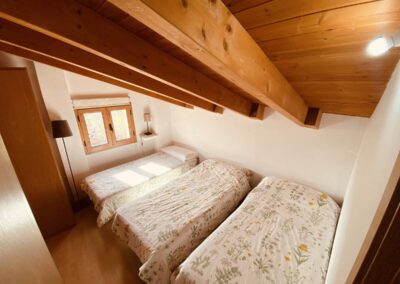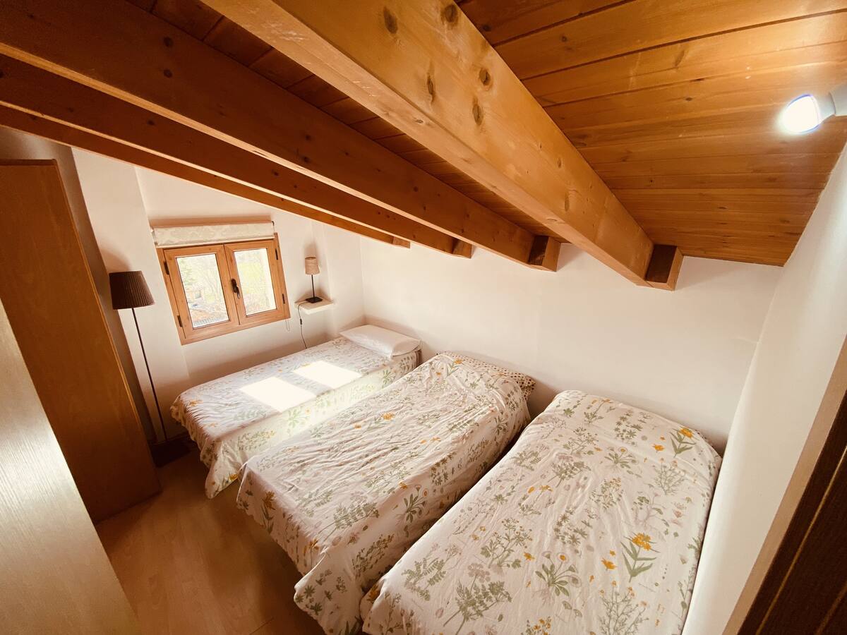 En la planta de arriba, se encuentra una encantadora buhardilla con capacidad para 5 camas individuales. Desde esta zona, podrás disfrutar de una ventana que ofrece vistas al cielo, permitiéndote observar el impresionante cielo estrellado durante la noche.