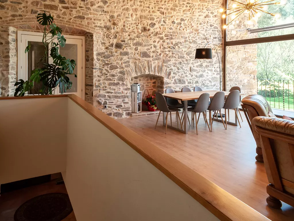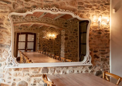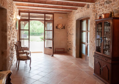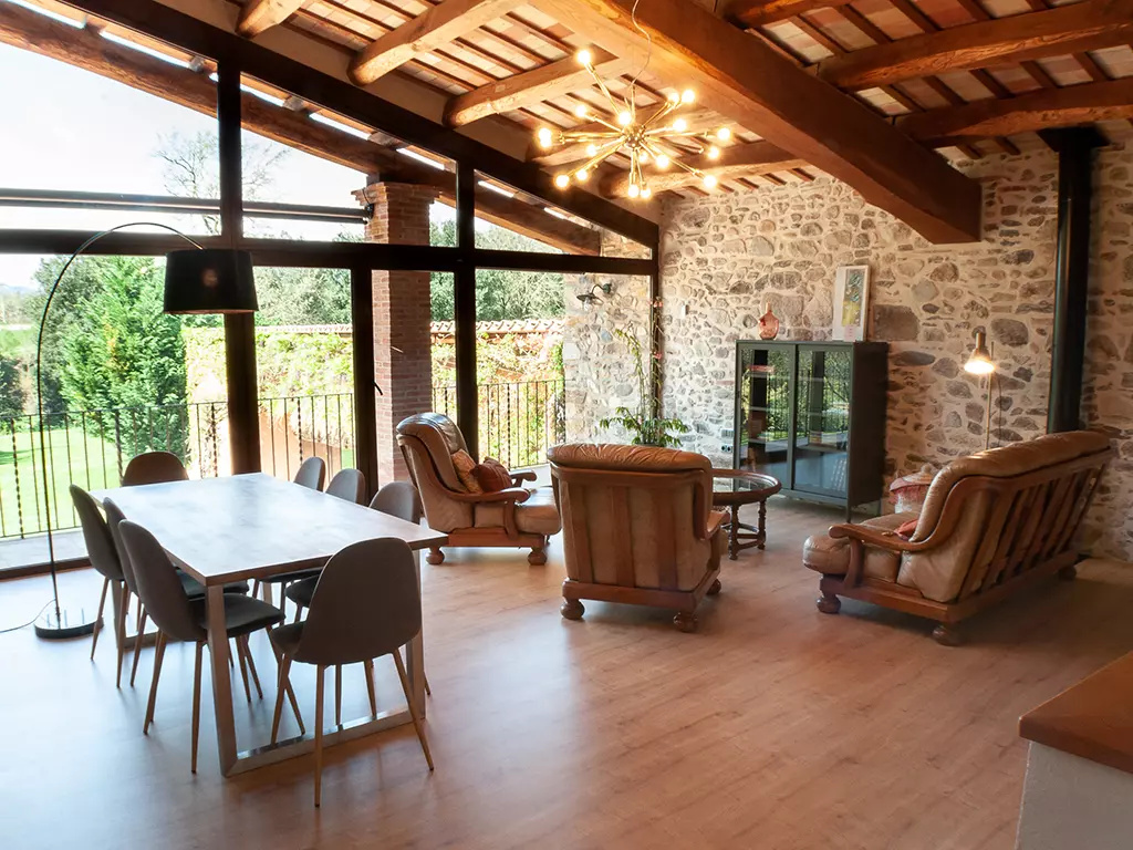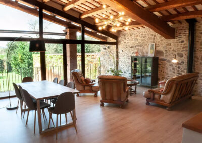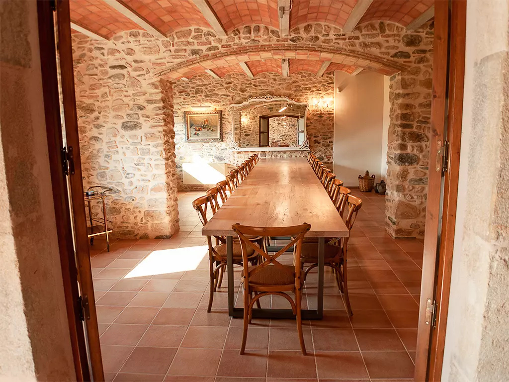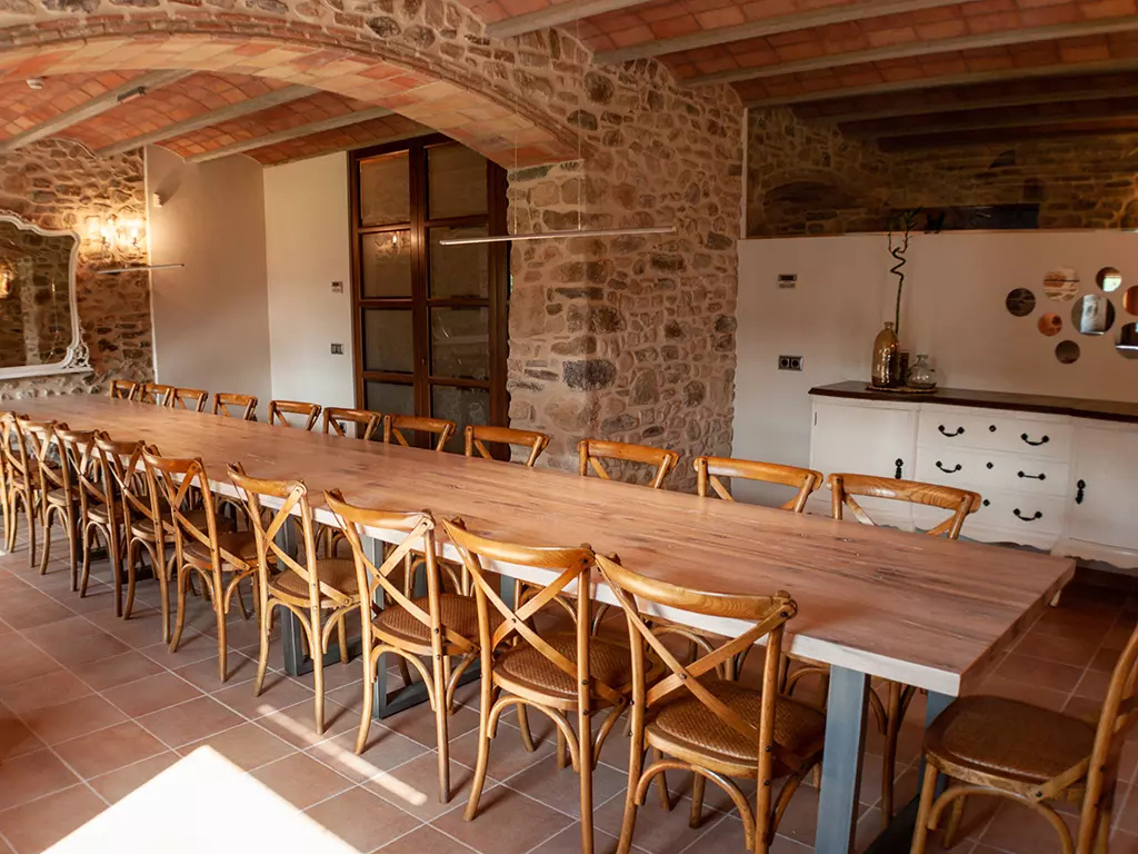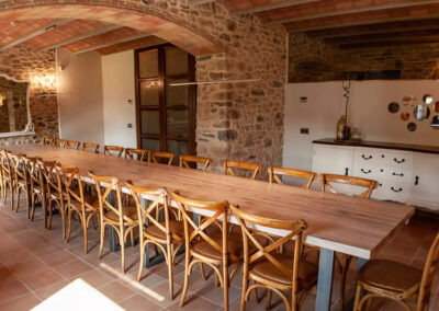 Frente a la cocina se sitúa el comedor principal, un espacio con paredes de piedra y bóveda catalana, presidido por una gran mesa de madera donde reunirse para disfrutar de comidas compartidas y largas sobremesas. Sus ventanas con vistas al jardín aportan luz natural y una atmósfera cálida y acogedora.