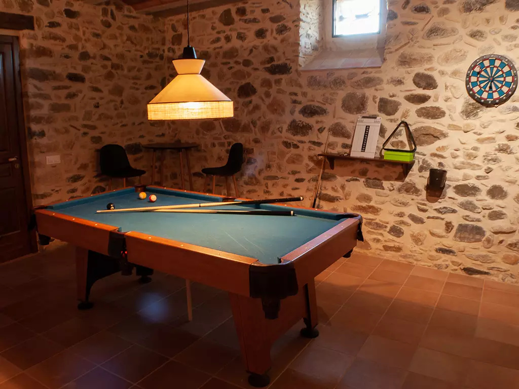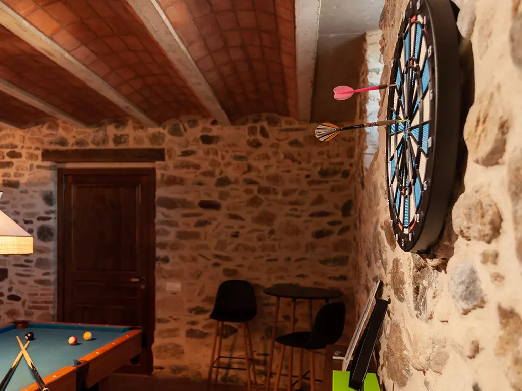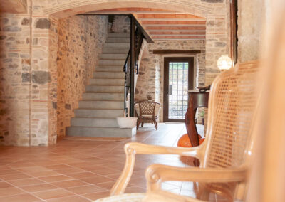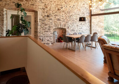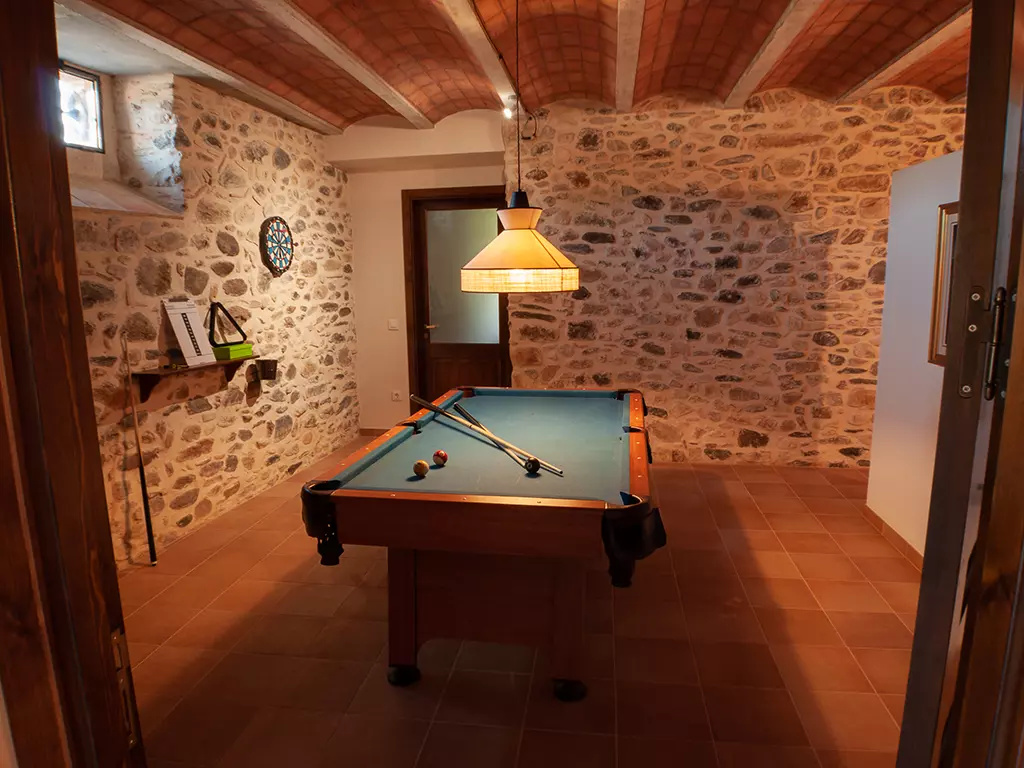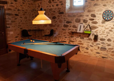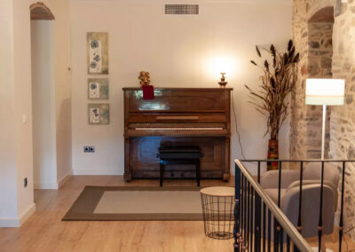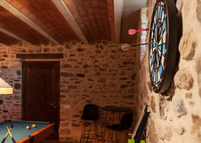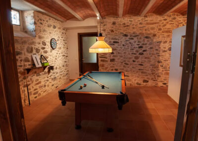 En la primera planta se encuentra la biblioteca, una de las estancias más especiales de la masía, con techos altos, vigas de roble restauradas y un balcón con vistas a la era y al jardín, perfecta para leer, jugar a juegos de mesa o disfrutar de una charla tranquila. La casa también dispone de sala de ocio con billar y diana, un recibidor amplio y acogedor y una zona con piano, pensada para quienes disfrutan de pequeños momentos musicales.