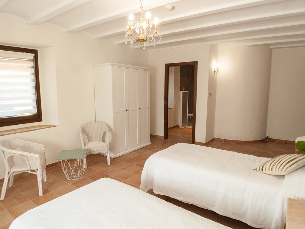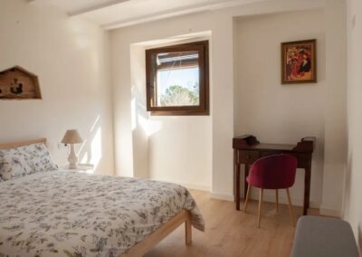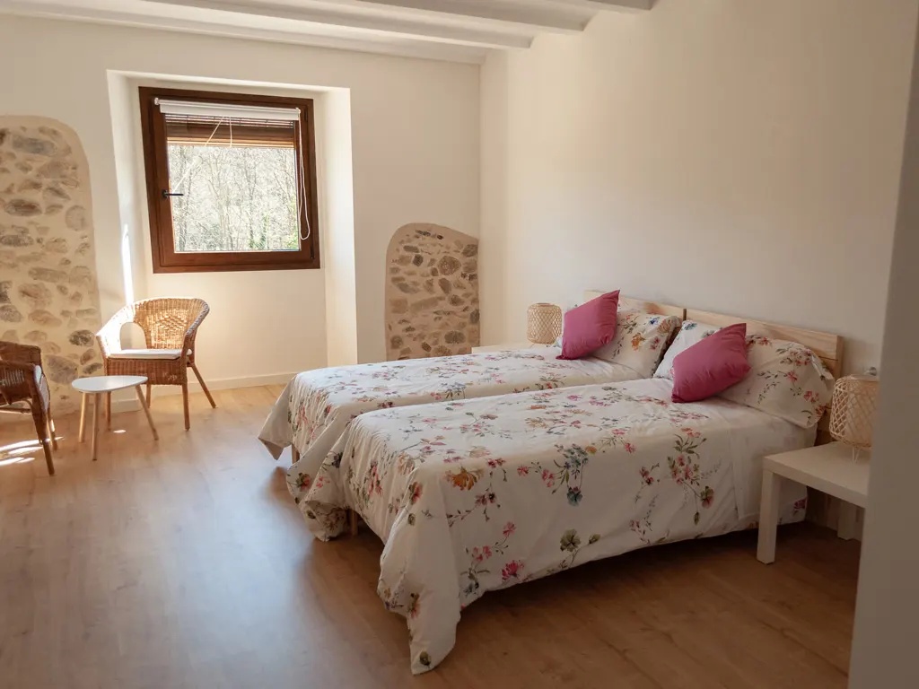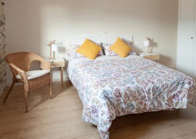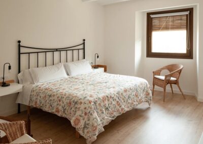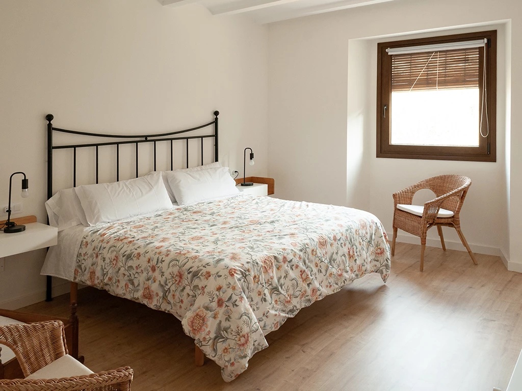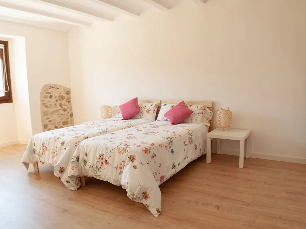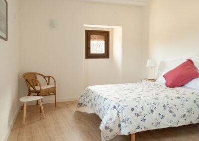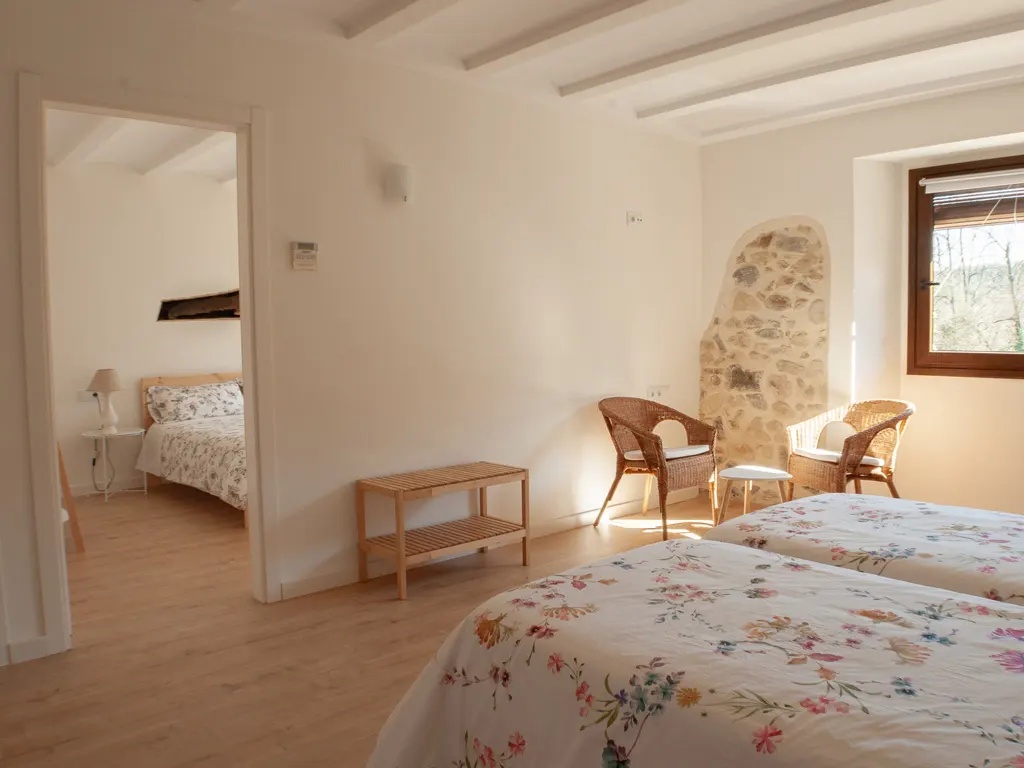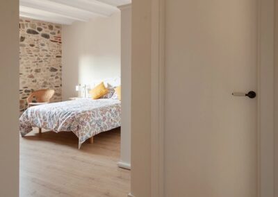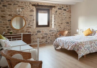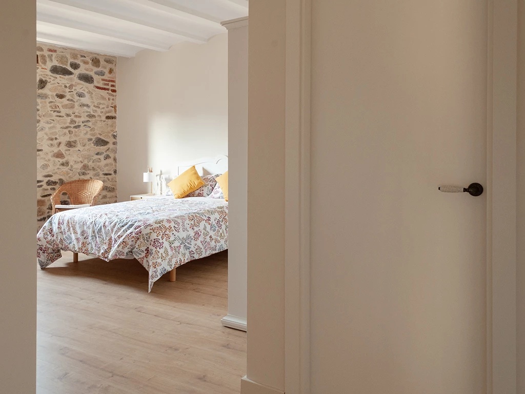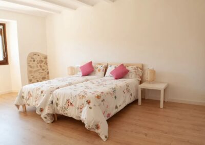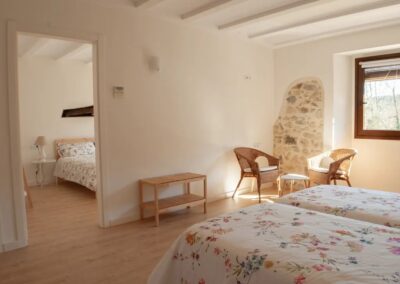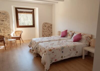 Ca n’Oller dispone de 9 habitaciones en total, todas ellas completamente reformadas, con baño privado y decoradas con una cuidada combinación de estilo rústico catalán y detalles contemporáneos. La distribución permite alojar cómodamente a 20 huéspedes, ofreciendo diferentes tipologías pensadas para adaptarse a todo tipo de grupos.