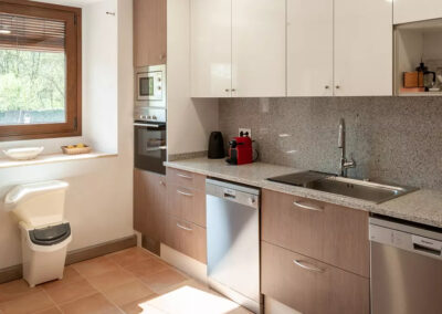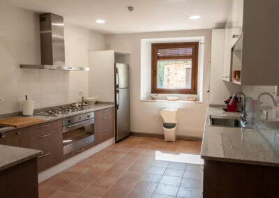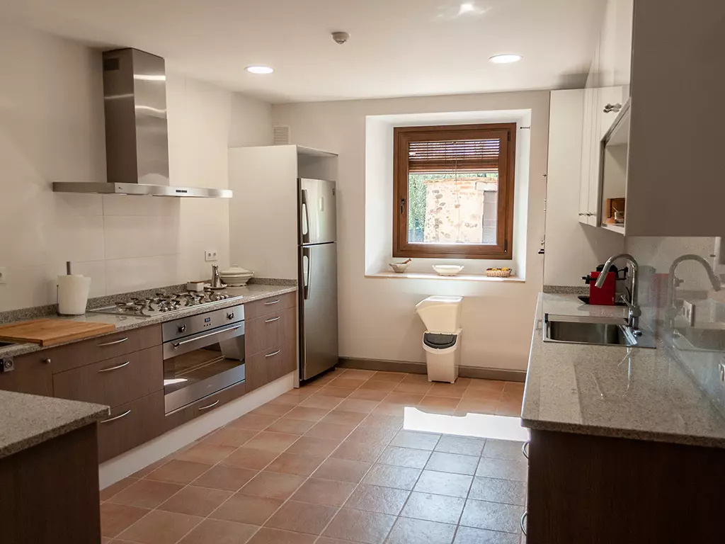 La masía cuenta con una cocina amplia de casi 30 m², totalmente equipada para grupos numerosos, pensada para un uso práctico y cómodo. Dispone de horno de gran capacidad, amplias encimeras, menaje completo, una nevera combi con congelador, una segunda nevera en la despensa y dos lavavajillas, facilitando la organización de las comidas y la comodidad durante toda la estancia.