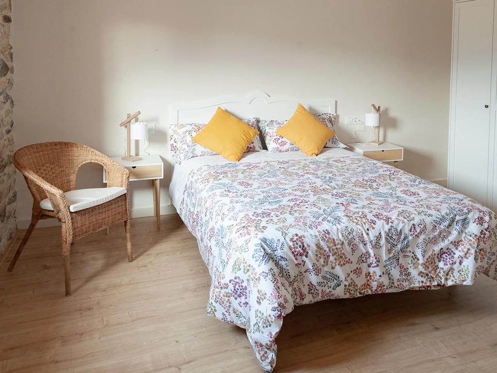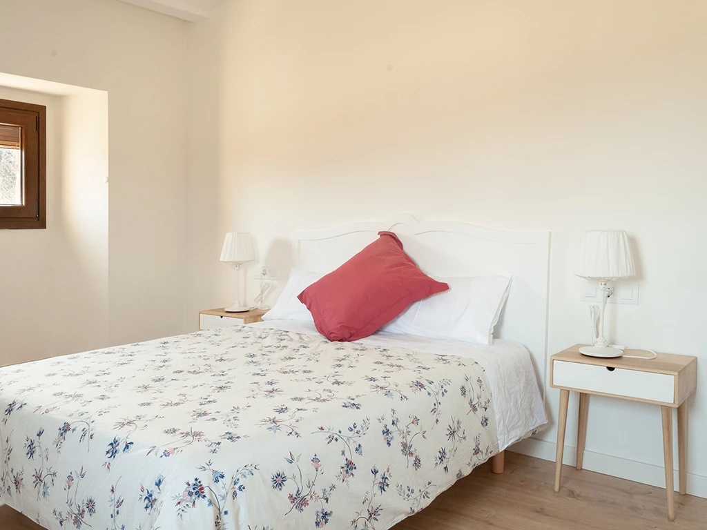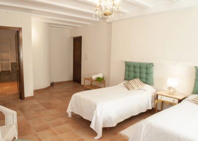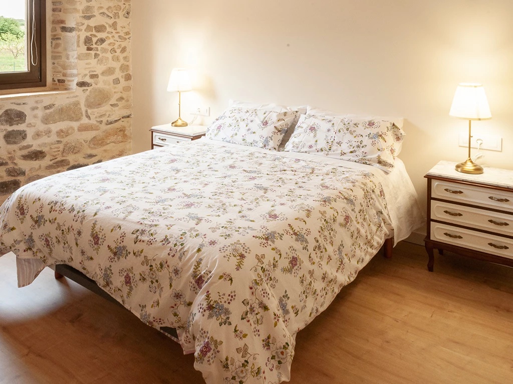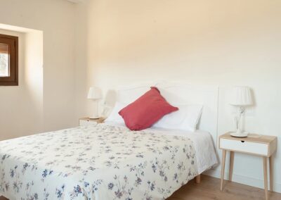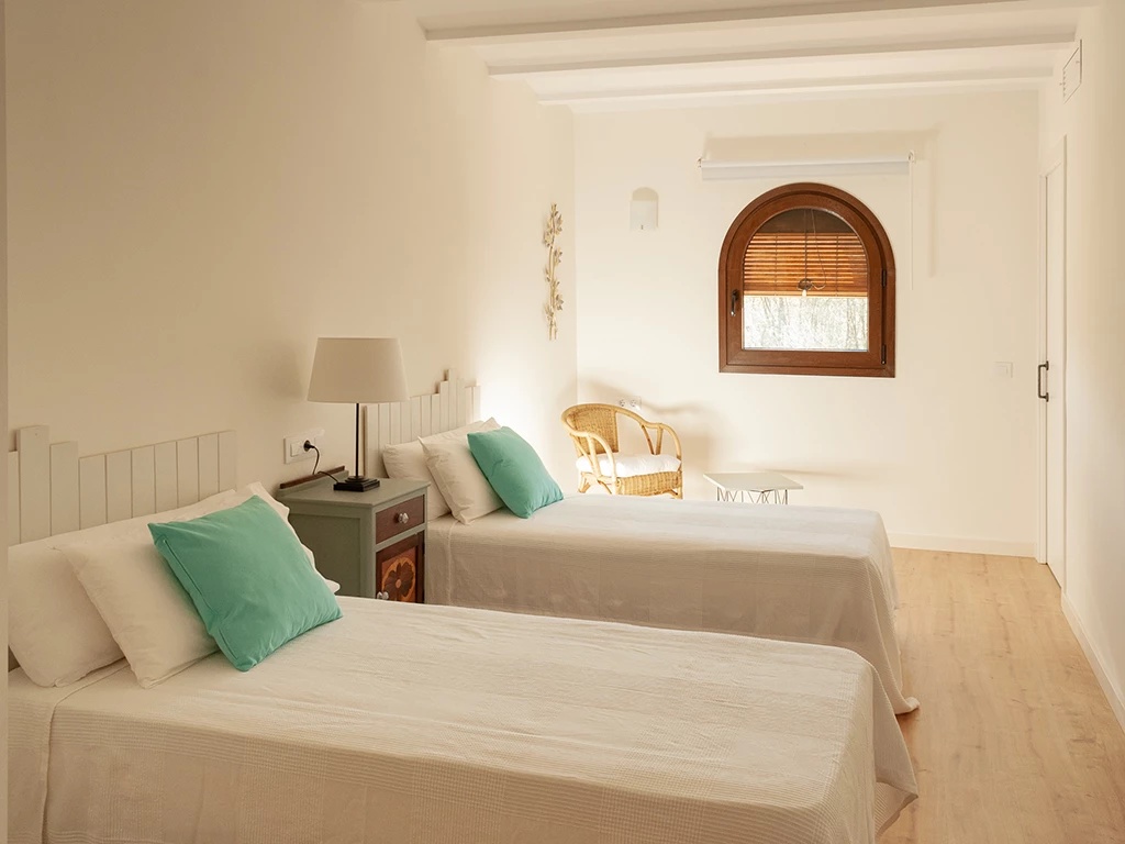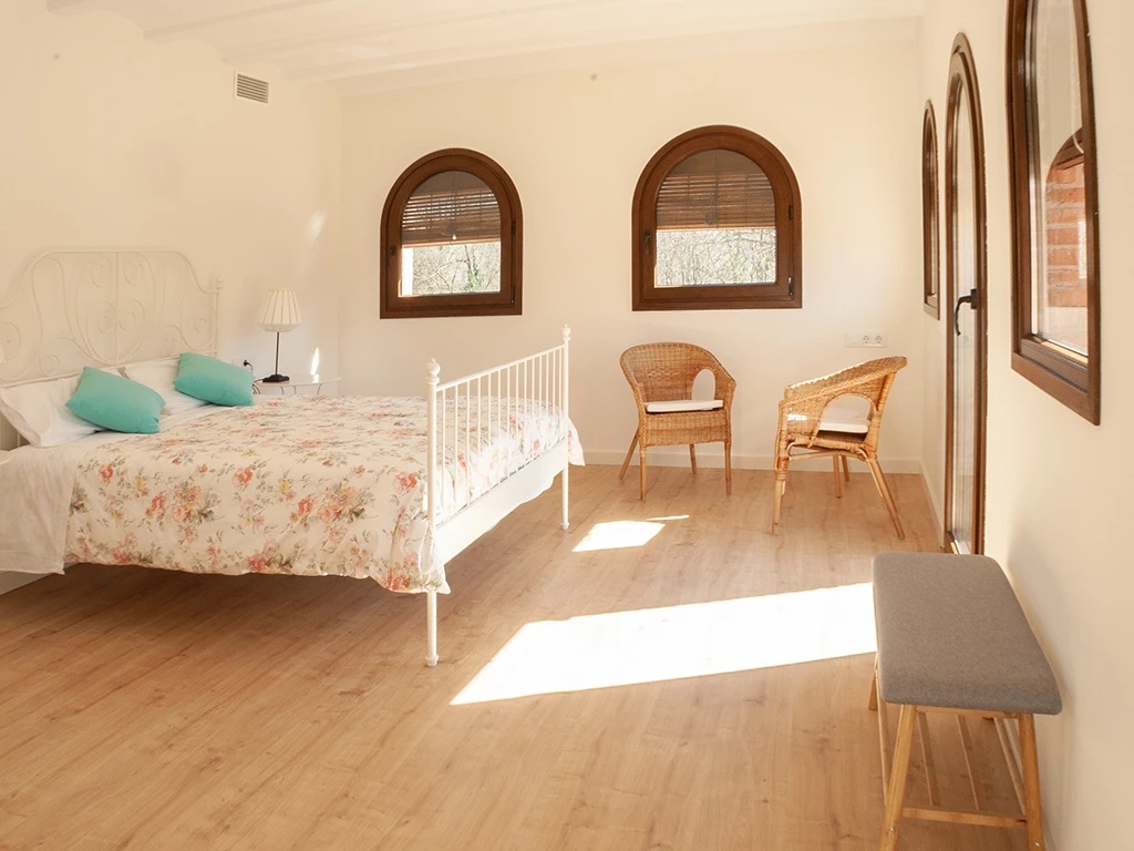 La masía cuenta con habitaciones dobles con cama de 150 cm, 160 cm y 180 cm, así como habitaciones con dos camas individuales de 90 cm. Una de ellas es una suite familiar, formada por dos espacios comunicados, ideal para familias que viajan con niños, y otra es una habitación totalmente adaptada para personas con movilidad reducida, con amplias dimensiones y baño accesible.