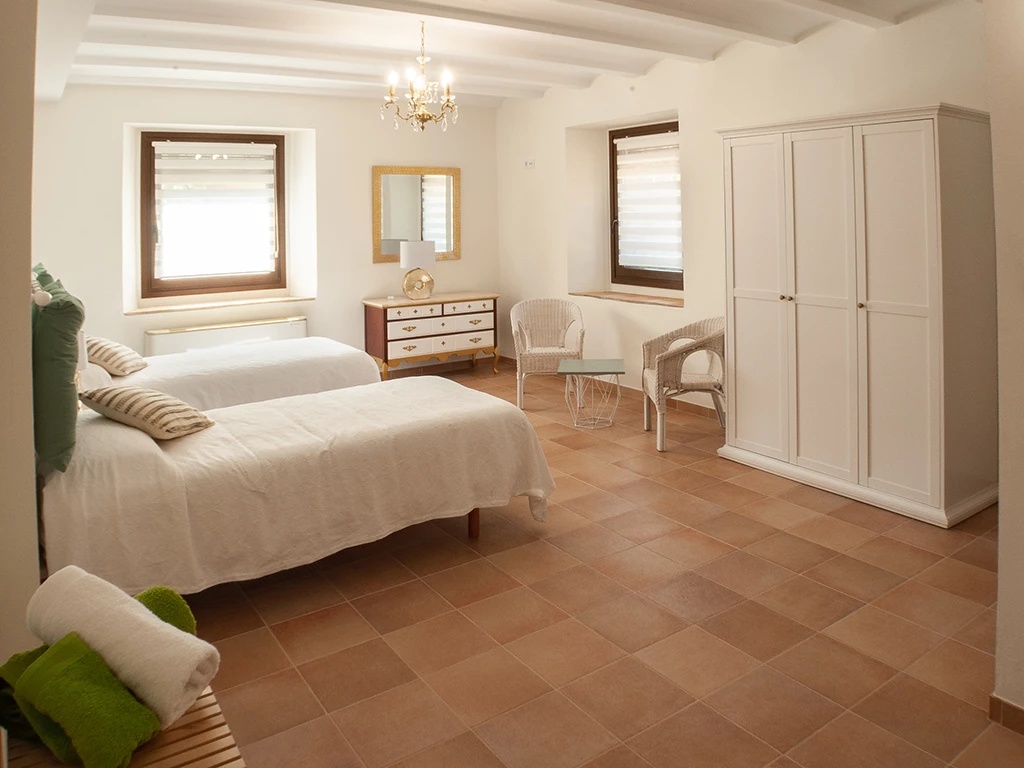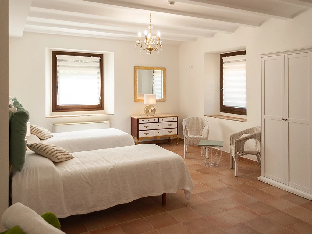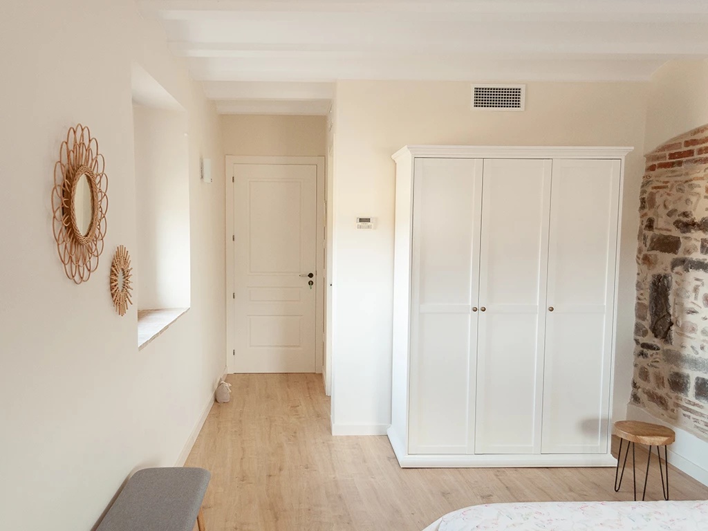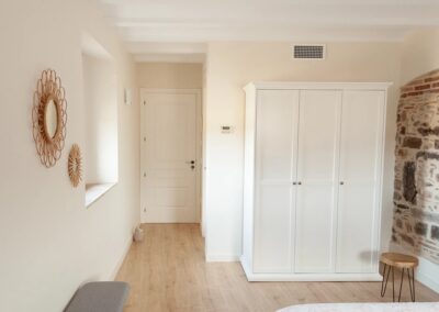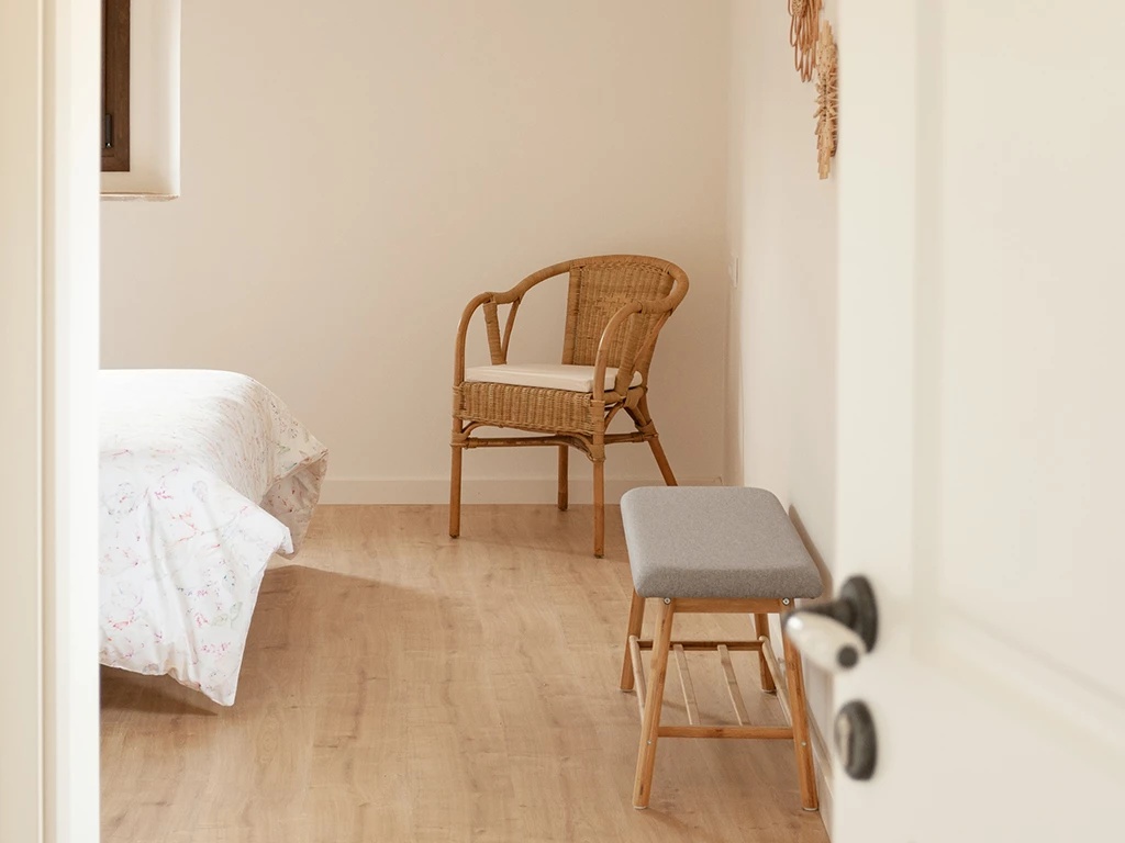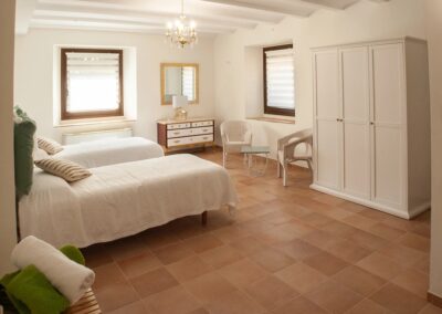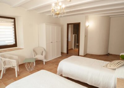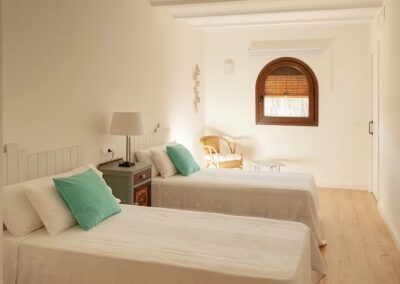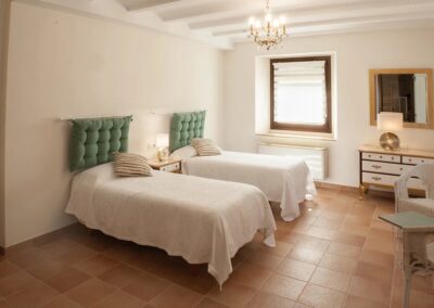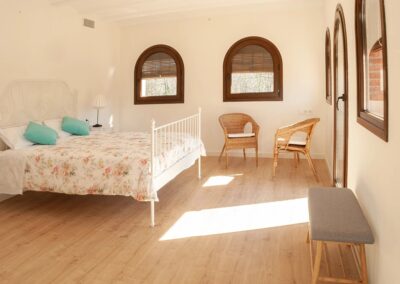 La masía cuenta con habitaciones dobles con cama de 150 cm, 160 cm y 180 cm, así como habitaciones con dos camas individuales de 90 cm. Una de ellas es una suite familiar, formada por dos espacios comunicados, ideal para familias que viajan con niños, y otra es una habitación totalmente adaptada para personas con movilidad reducida, con amplias dimensiones y baño accesible.