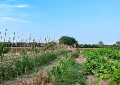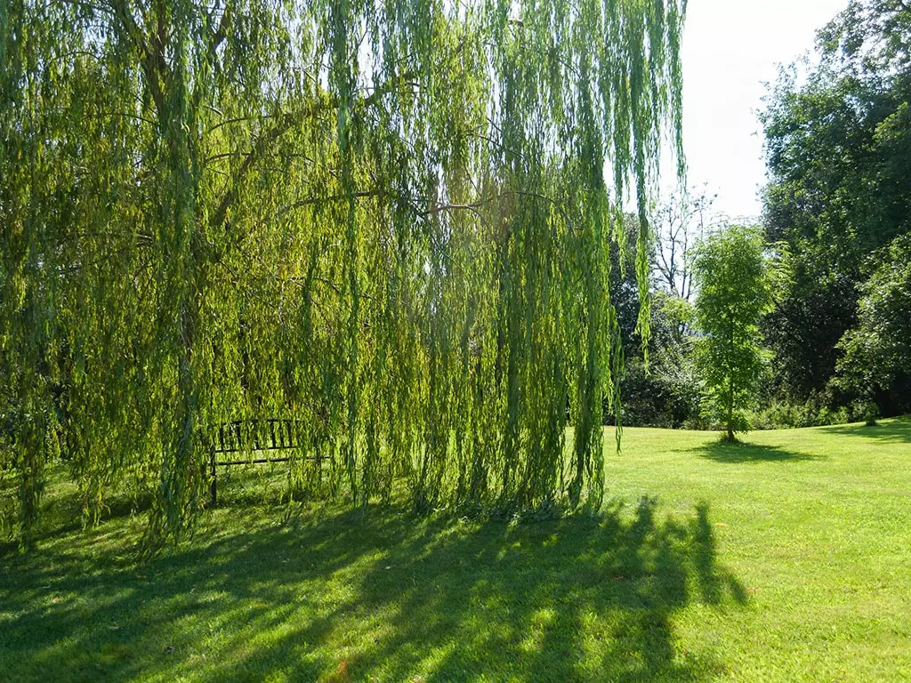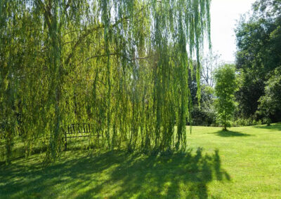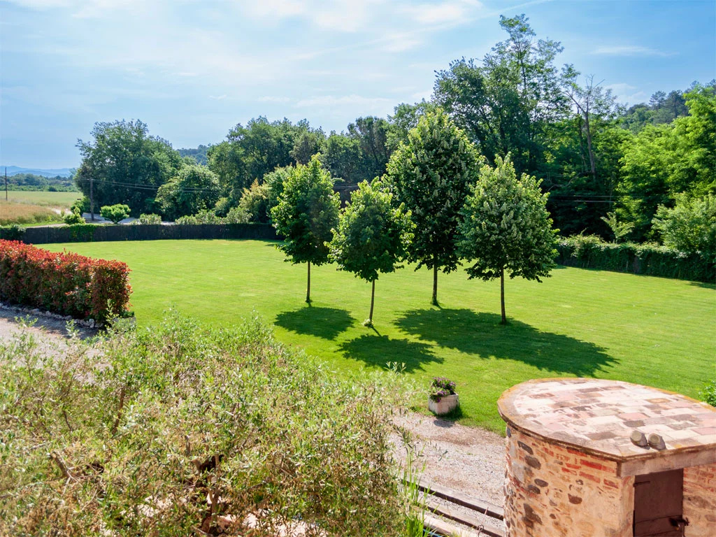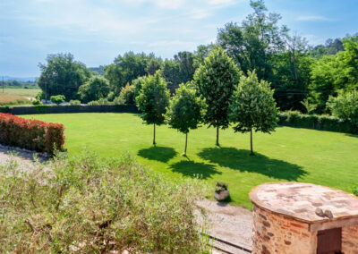 Ca n’Oller está rodeada de una extensa zona ajardinada que convive en armonía con el entorno rural. El jardín principal, con amplias zonas de césped y espacios de sombra natural, invita al paseo, al juego y al descanso. La era circular restaurada y el entorno del majestuoso sauce llorón conforman uno de los rincones más singulares de la finca, acompañados de elementos tradicionales como olivo, pozo y estanque ornamental.