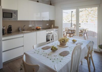 El espacio principal, que alberga la cocina, el comedor y la sala de estar, se abre a una amplia terraza con vistas espectaculares a la montaña. En la terraza, se encuentra una barbacoa completamente equipada con leña, parrillas y pastillas para el fuego, ideales para disfrutar de comidas al aire libre. La cocina está totalmente equipada con una encimera de inducción, nevera, congelador, microondas, horno, lavavajillas y cafeteras tanto Dolce Gusto como italiana.