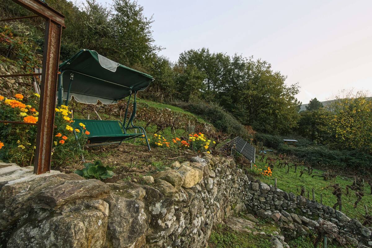 En el exterior, la cabaña cuenta con una terraza equipada con barbacoa y mobiliario de jardín, perfecta para disfrutar de una comida al aire libre rodeado de viñedos. Cerca de la cabaña, podrás explorar «O Trono do Rei», la «Fuente de los Deseos» o el «Mirador do Rei», lugares ideales para capturar fotos inolvidables. Además, hay rutas de senderismo que atraviesan viñedos y conducen hasta el arroyo del monte de roca, donde el agua crea pequeñas cascadas antes de desembocar en el río Miño.
