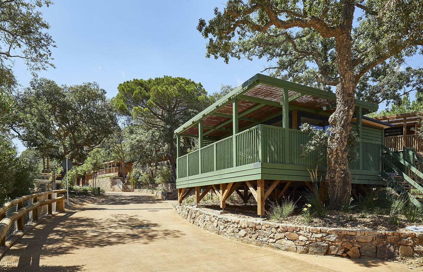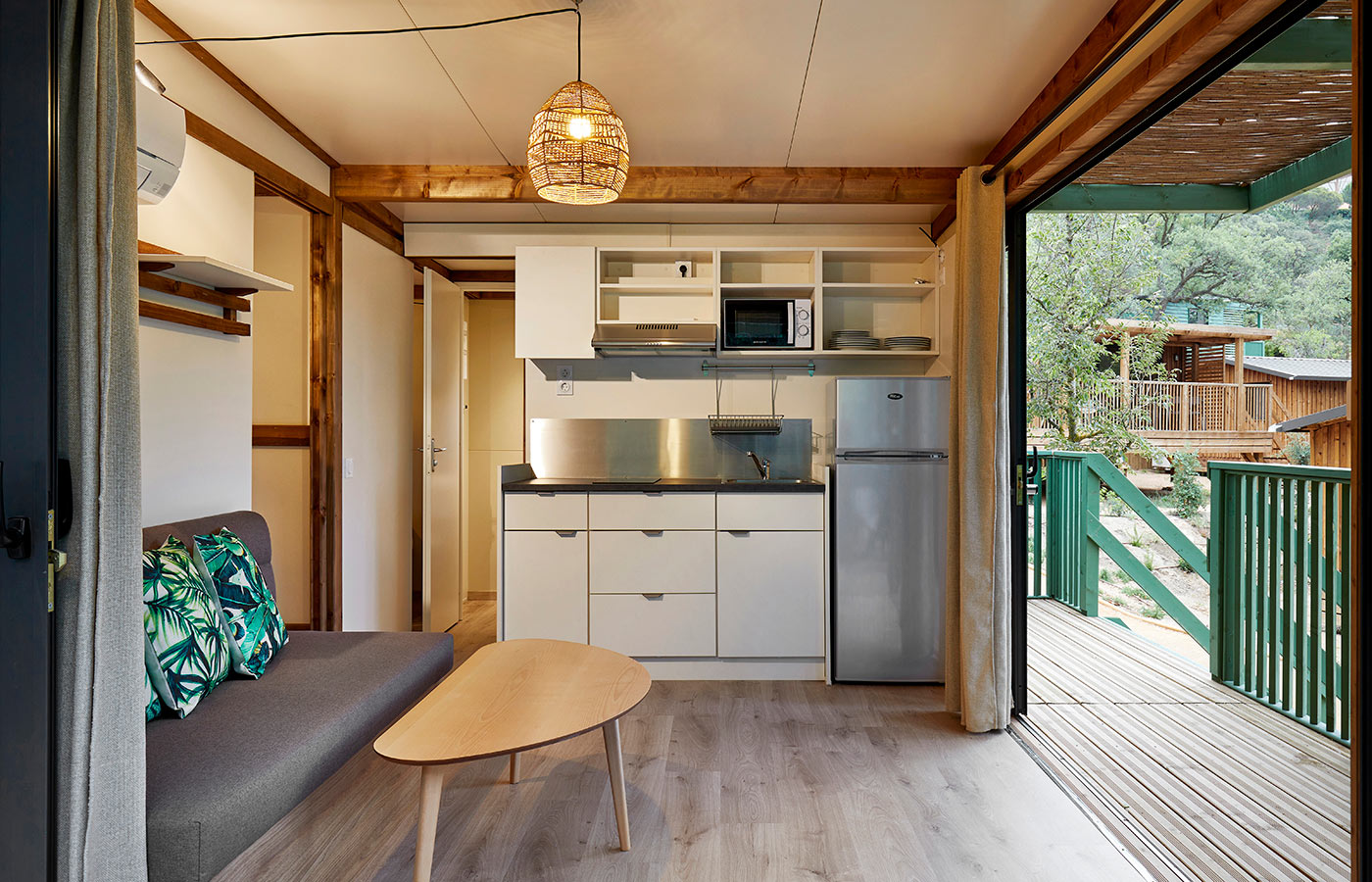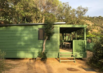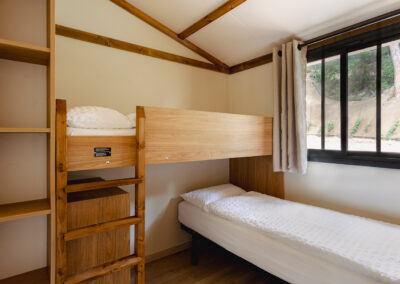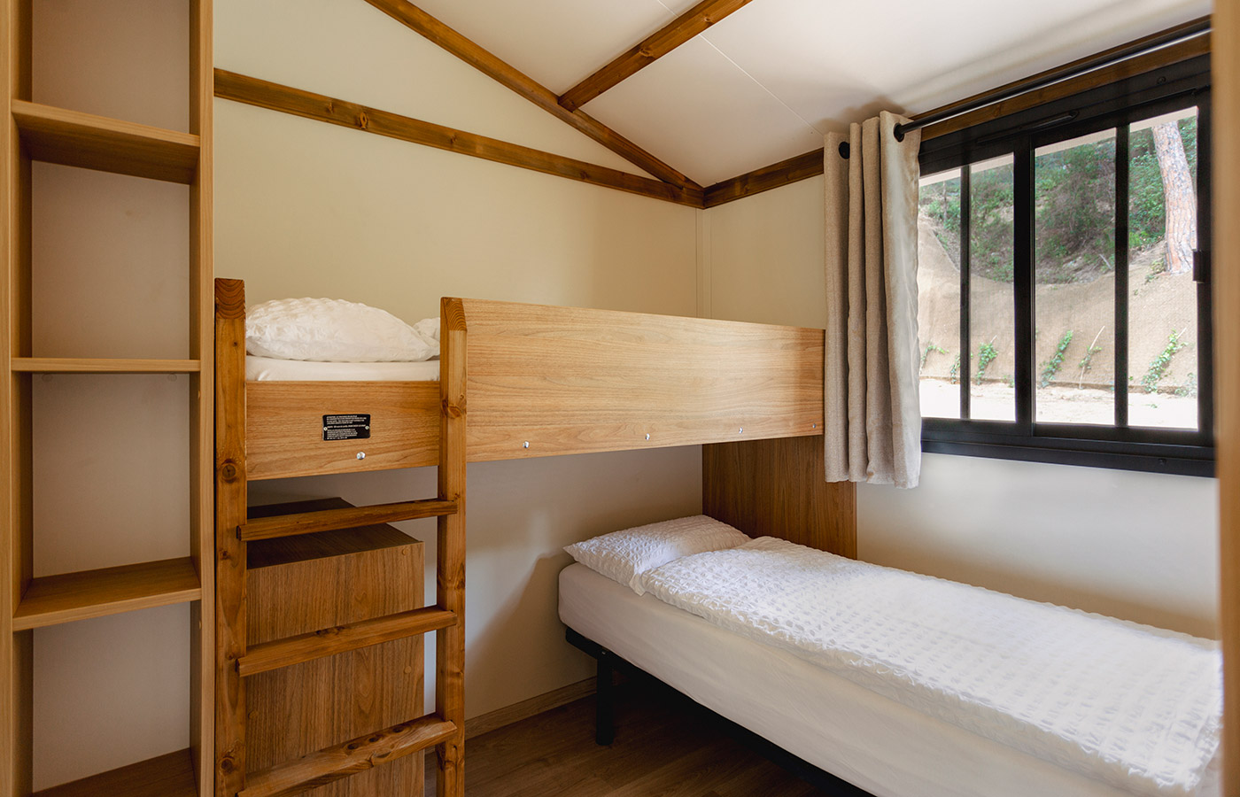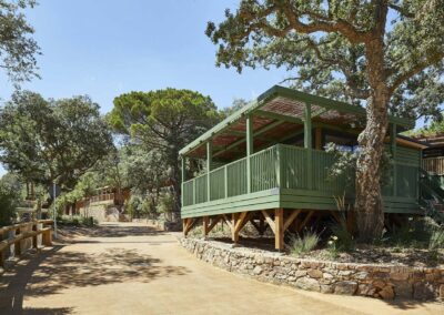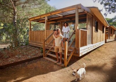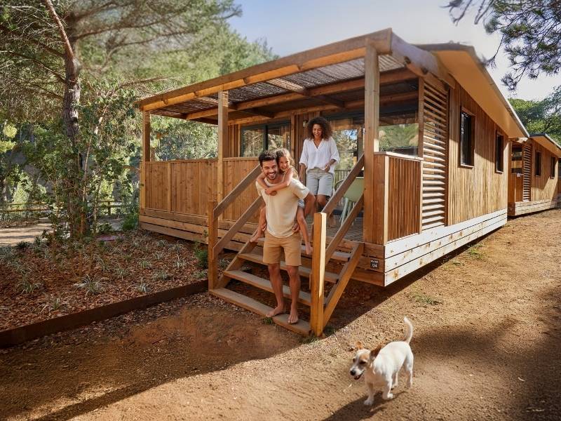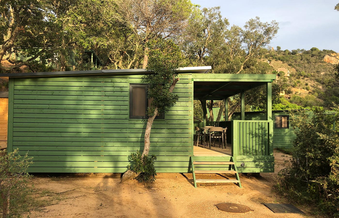 El camping cuenta con una variada oferta de bungalows diseñados para satisfacer las necesidades de sus huéspedes. Entre ellos, destaca el Bungalow Xaloc, ideal para familias y mascotas, con capacidad para 5 personas y una distribución práctica en 2 habitaciones dentro de 25 m². También están disponibles los bungalows Tramuntana, Garbí y Mestral, con opciones para alojar hasta 6 personas, cada uno ofreciendo diferentes configuraciones, todas pensadas para garantizar una estancia cómoda.
