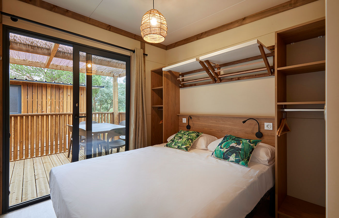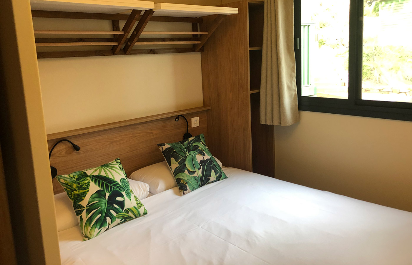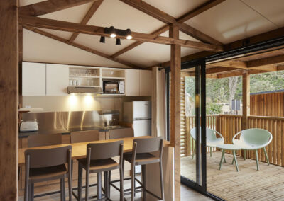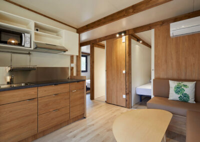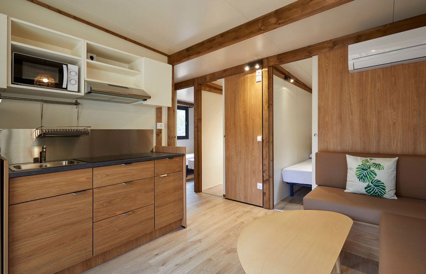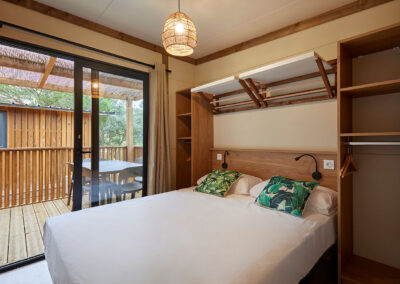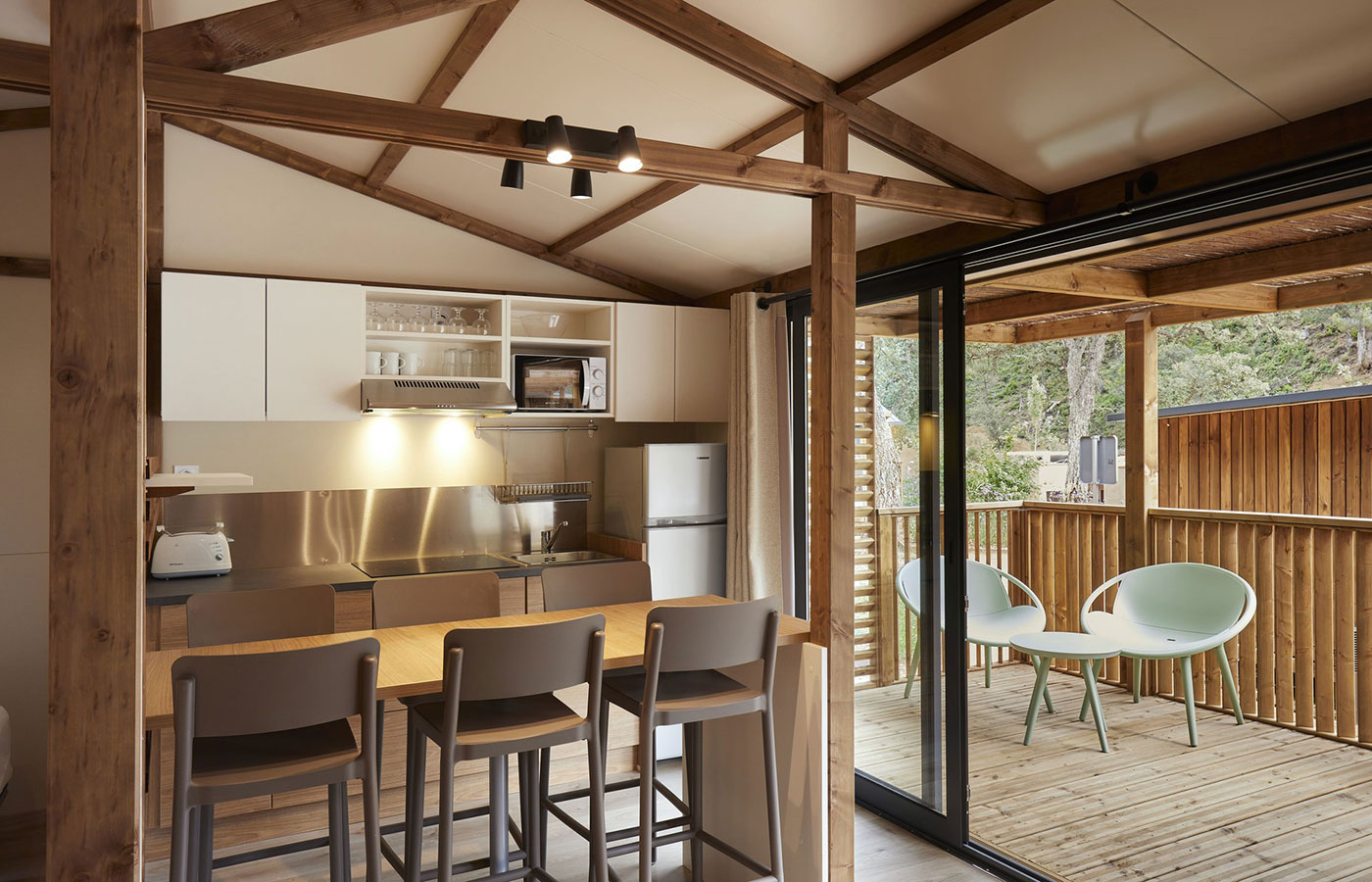El camping cuenta con una variada oferta de bungalows diseñados para satisfacer las necesidades de sus huéspedes. Entre ellos, destaca el Bungalow Xaloc, ideal para familias y mascotas, con capacidad para 5 personas y una distribución práctica en 2 habitaciones dentro de 25 m². También están disponibles los bungalows Tramuntana, Garbí y Mestral, con opciones para alojar hasta 6 personas, cada uno ofreciendo diferentes configuraciones, todas pensadas para garantizar una estancia cómoda.