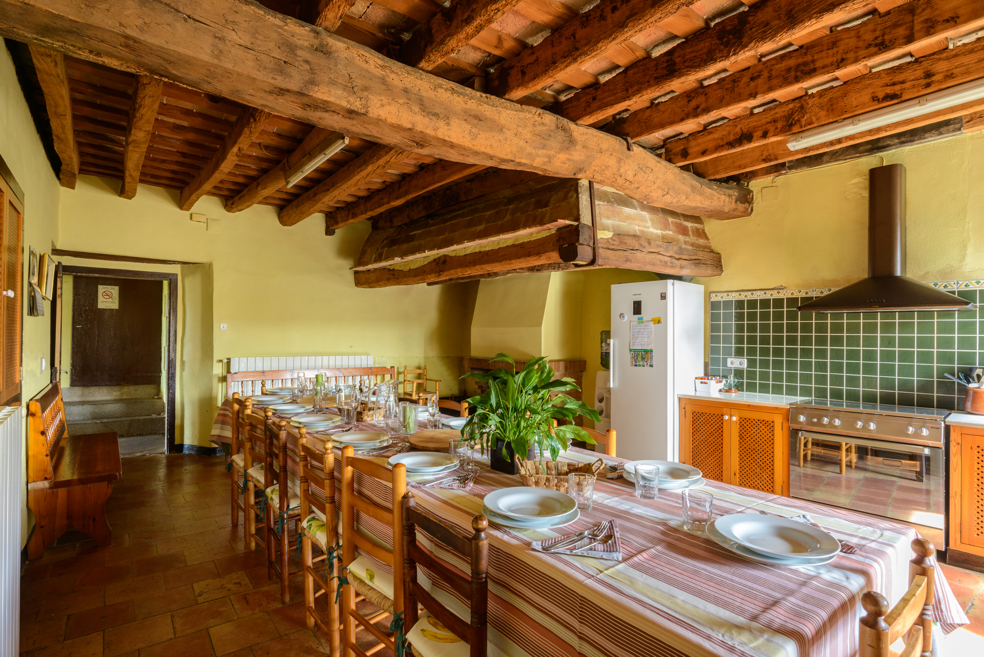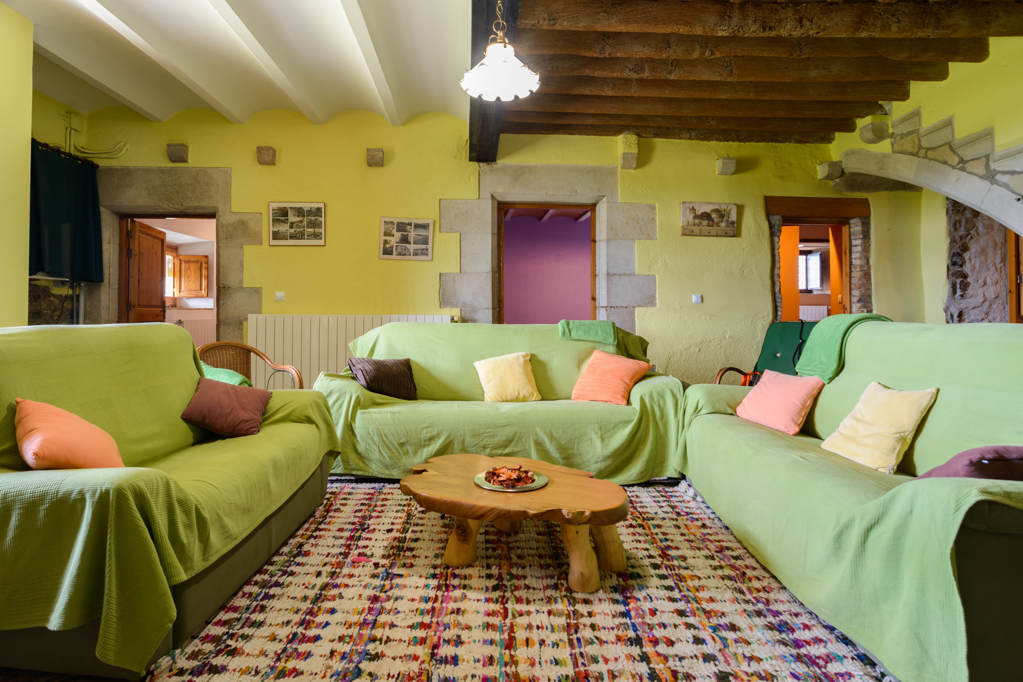 En el interior de la masía, encontrarás todas las comodidades necesarias para disfrutar de una estancia confortable: una cocina completamente equipada con área de comedor y chimenea, un acogedor salón con cómodos sofás, 5 habitaciones y 3 baños completos.