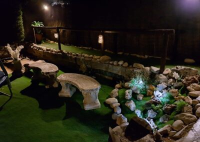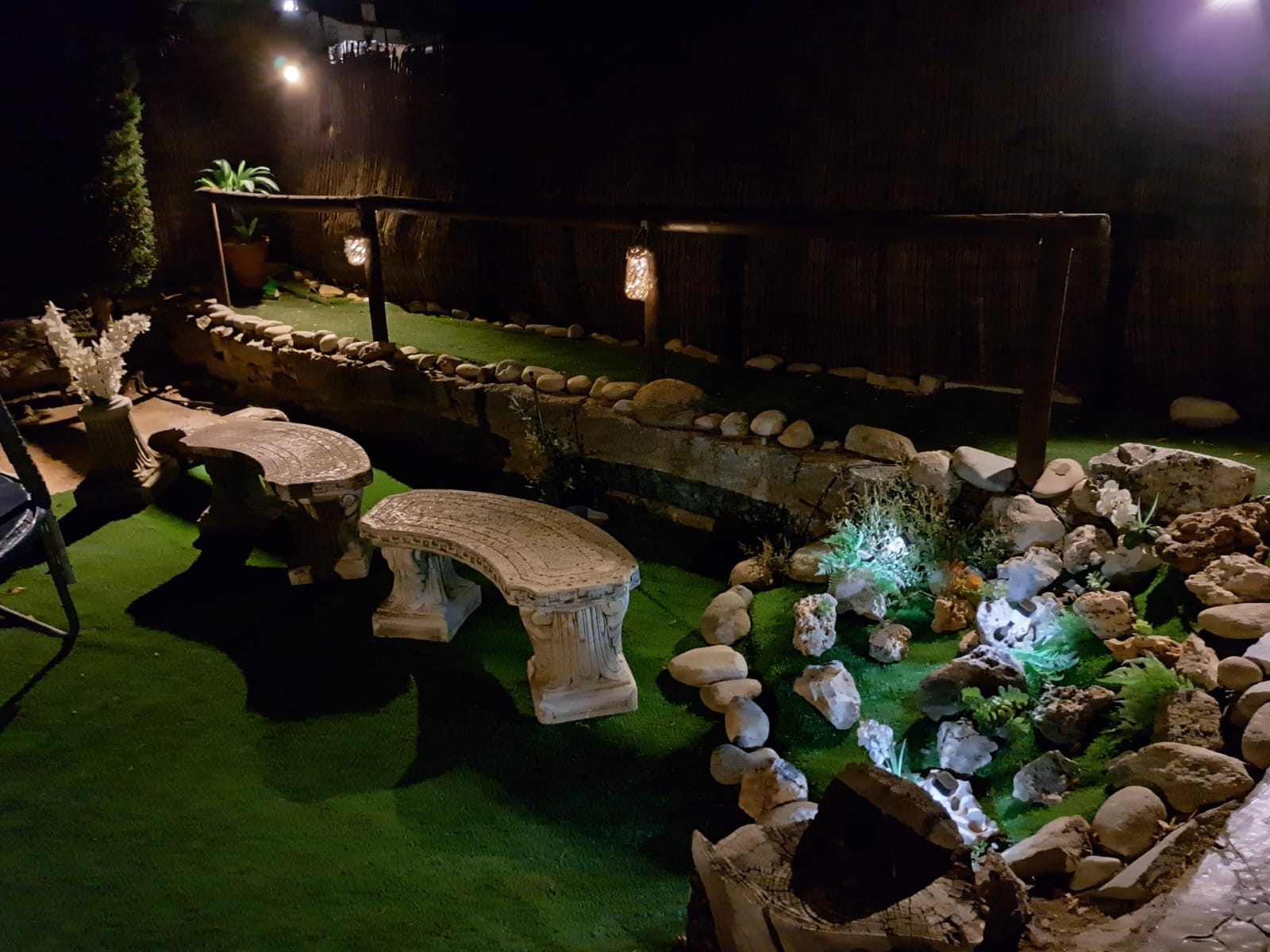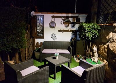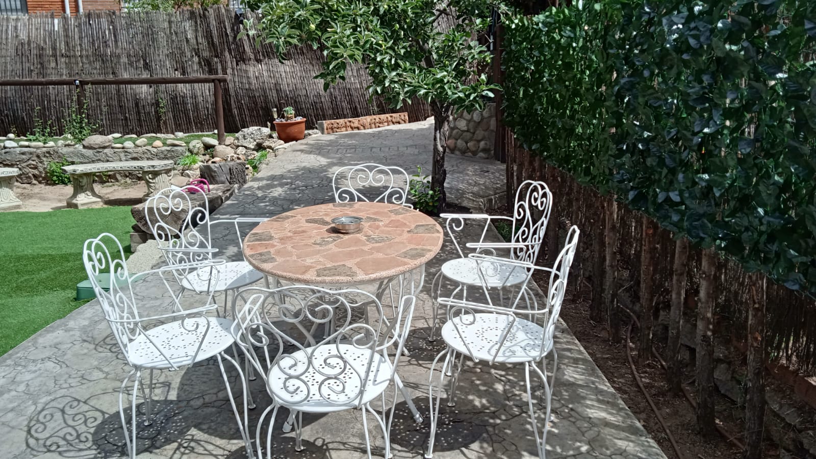 Consta de un maravilloso jardín con barbacoa, muebles de jardín y dos tallas en madera que, sin duda, serán la atracción de nuestros clientes. Cuenta con una zona extra de descanso (chill out) y un parque infantil con columpios y diversión para los más pequeños.
