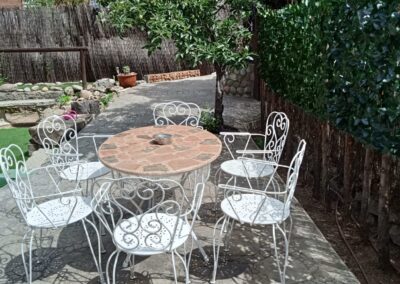 Además en esta zona exterior también hay un espacio habilitado para comilonas con barbacoa. Asimismo hay diversas zonas ajardinadas, aparcamiento, paseos construidos de piedra y un pozo.
