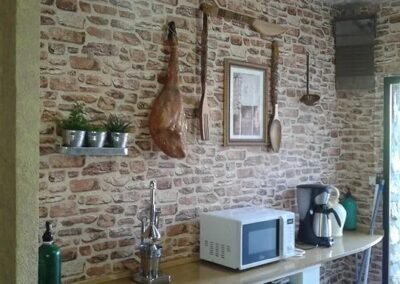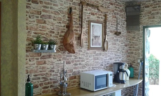 1 cocina con pared de piedra y decoración de utensilios de cocina curiosos y antiguos. La cocina cuenta con los electrodomésticos necesarios.