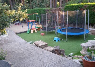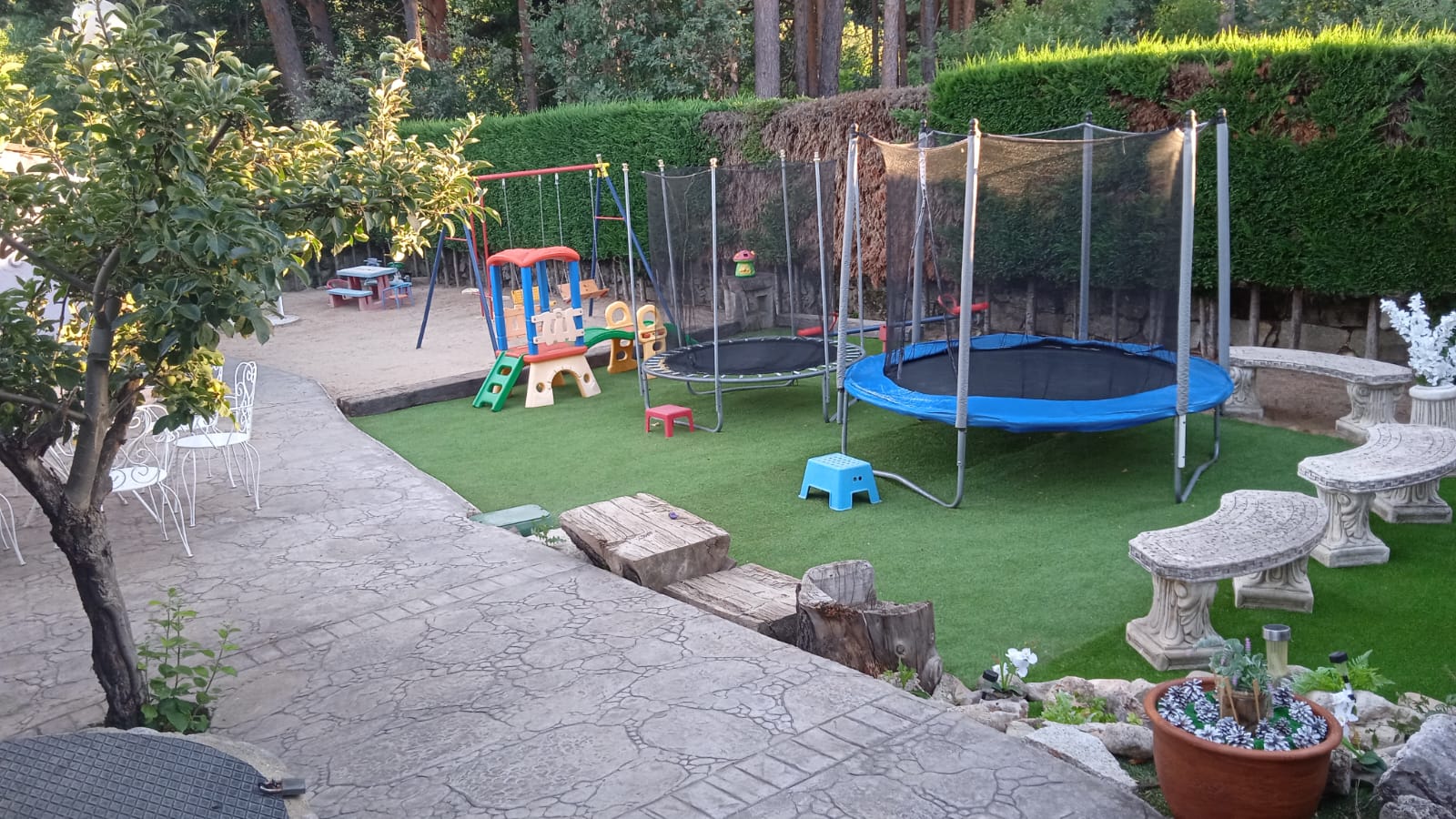 Una de sus mejores zonas es la parte exterior. Allí encontraréis un espacio muy grande donde se ha construido un parque infantil con suelo de arena y equipado con columpios, toboganes, juguetes y hasta dos camas elásticas.