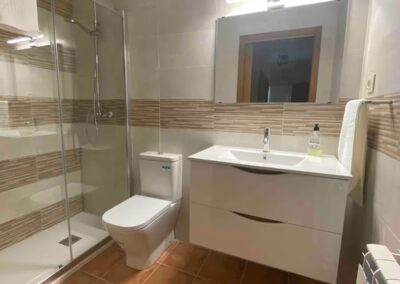 El segundo apartamento, situado en la planta alta, ofrece una espectacular terraza con vistas a la montaña, equipada con mesa y sillas, perfecta para disfrutar de un desayuno al aire libre. En su interior, cuenta con un amplio salón con cocina completamente equipada, además de tres habitaciones y dos baños. Su capacidad es de 8+6 personas, con opción a solicitar una cuna bajo petición. La superficie del apartamento varía entre 100 y 160 m², ocupando la primera planta y el ático, con acceso mediante una rampa exterior.