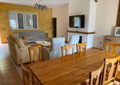 Este apartamento, con capacidad para 6+2 personas, se accede a través de un amplio porche amueblado con sillones y mesas para relajarse al aire libre. Aquí, los huéspedes podrán disfrutar de una agradable zona chill out y de un futbolín, ideal para compartir momentos en familia en cualquier época del año. En el interior, encontramos un acogedor salón-cocina con chimenea, totalmente equipada con menaje, así como tres habitaciones y dos baños.
