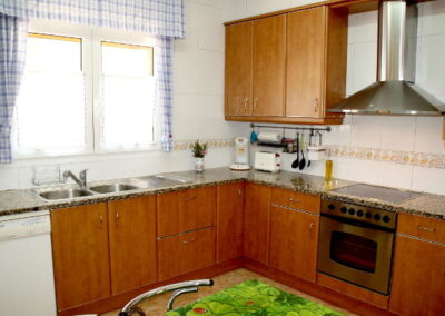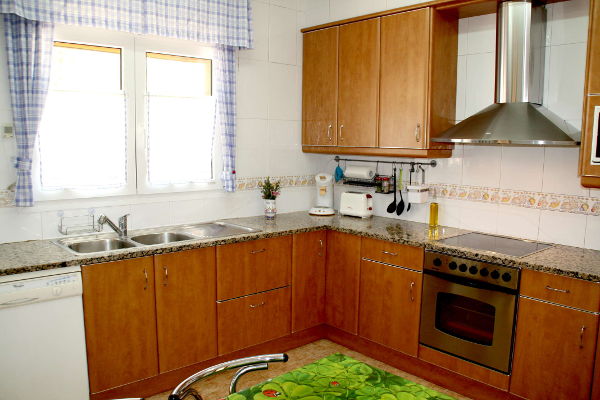 En la cocina: equipamiento básico para cocinar (utensilios, ollas, paella, colador, platos, vasos, cubiertos, etc.), papel de cocina, trapos de cocina, estropajo y jabón lavavajillas, bayeta, hule para la mesa, horno microondas con grill.