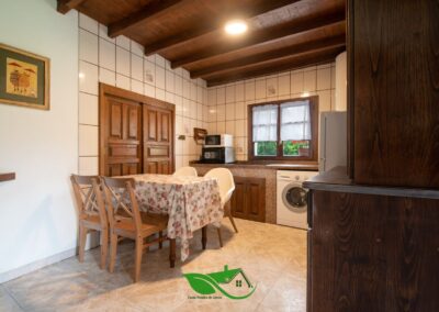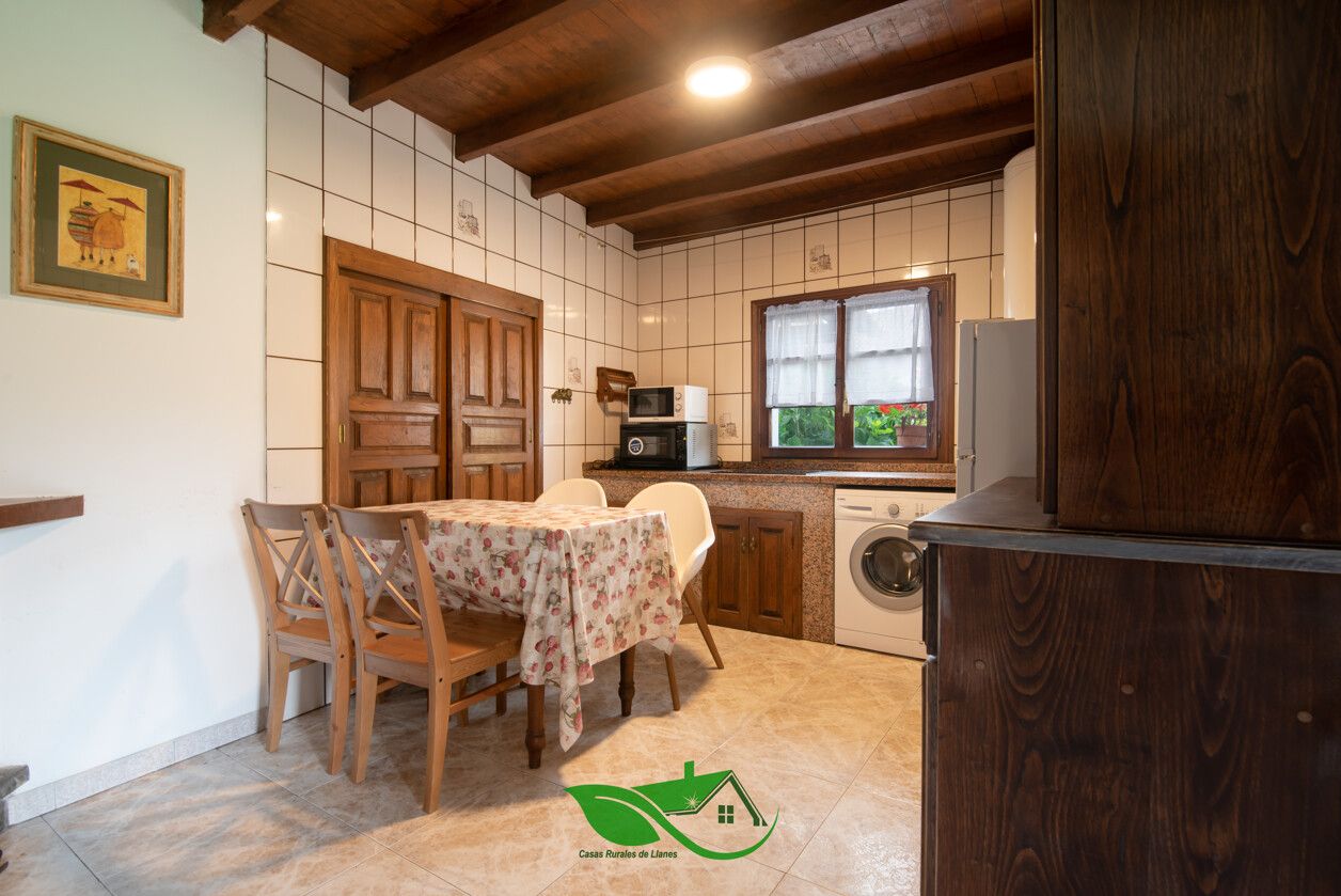 La cocina, como es característico en las buenas casas de campo, se erige como el corazón del alojamiento. Está totalmente equipada con fogones, microondas, un pequeño horno eléctrico, lavadora y todos los utensilios y menaje necesarios. Además, cuenta con una mesa de comedor para cuatro personas.