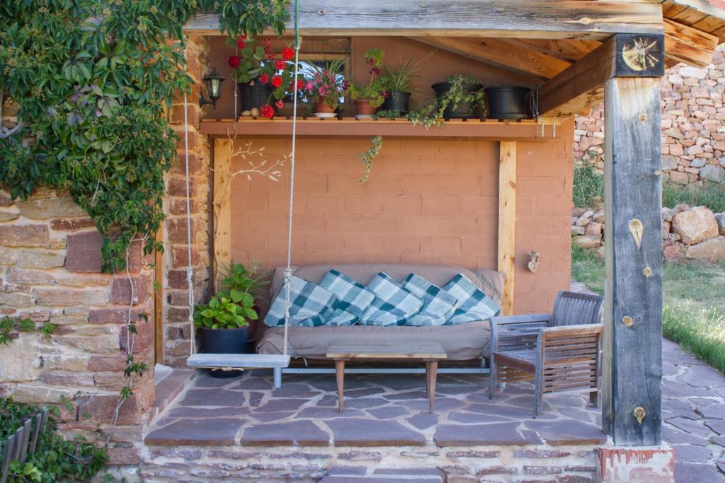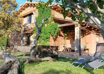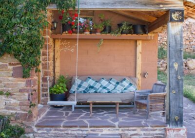 El exterior está preparado para disfrutarse al máximo. La casa cuenta con tres porches, uno por cada orientación, ideales para adaptarse al sol o a la sombra según el momento del día. Dispone además de zonas con mesas y bancos, una barbacoa con iluminación nocturna para disfrutar de cenas al aire libre y, en verano, una piscina desmontable perfecta para refrescarse en los días de más calor.