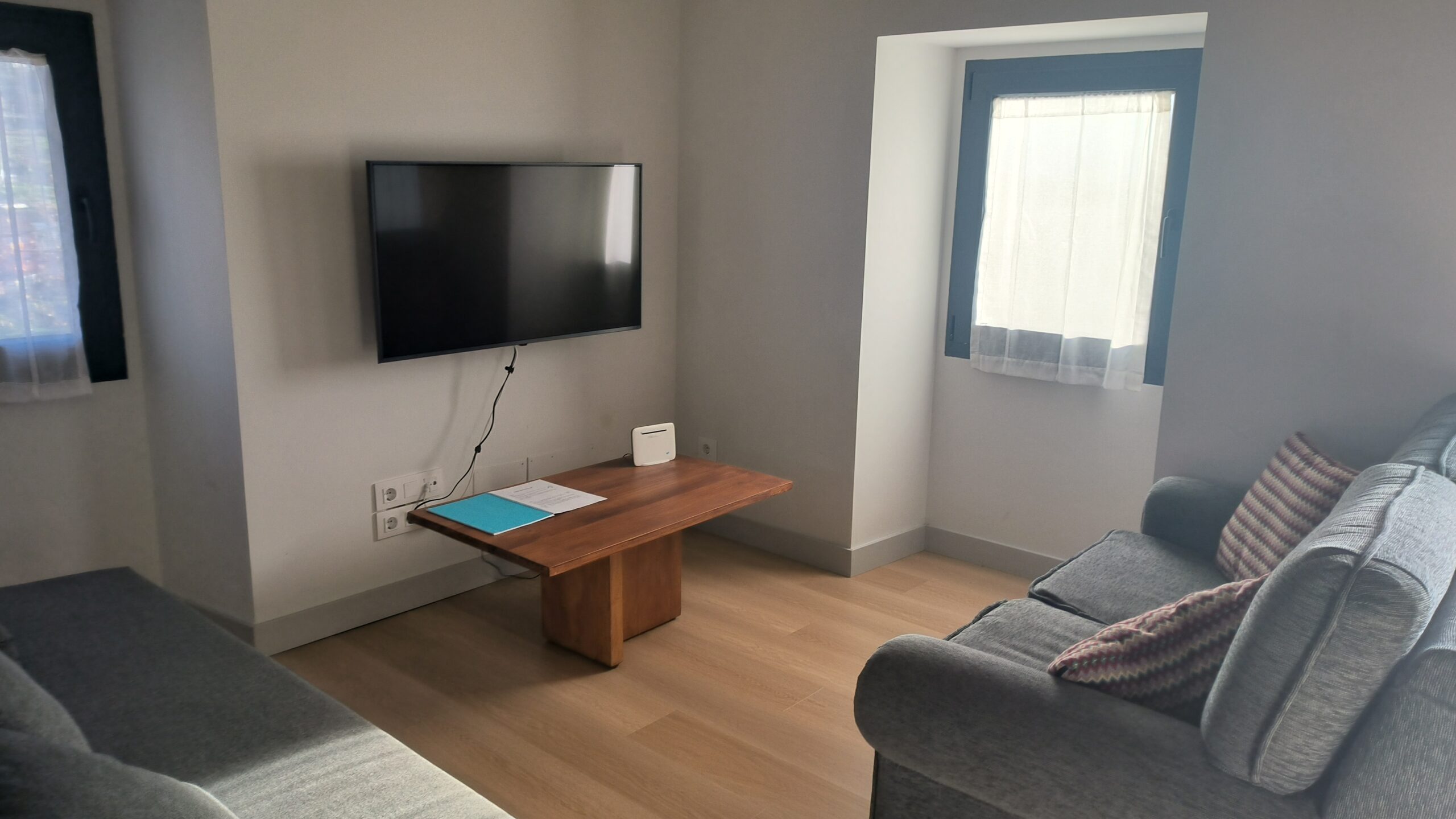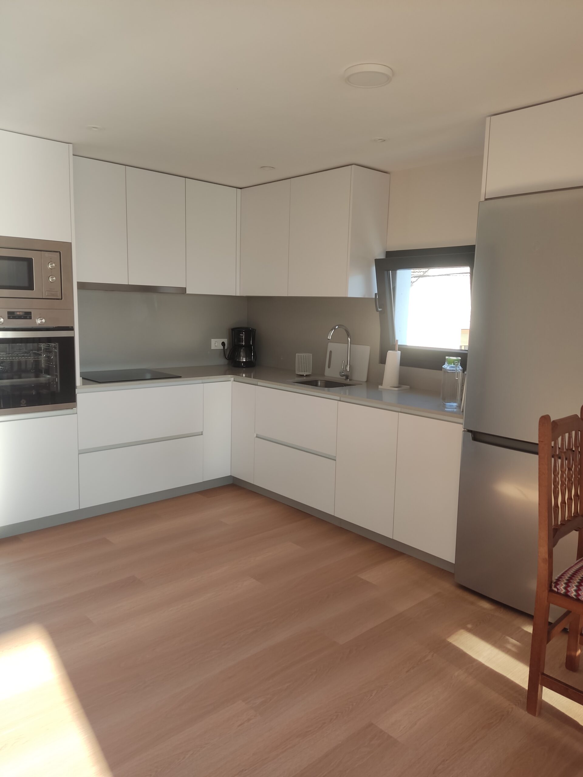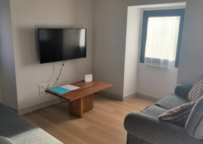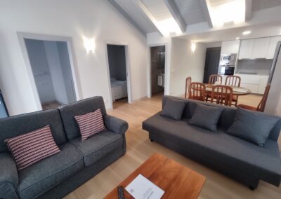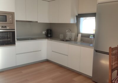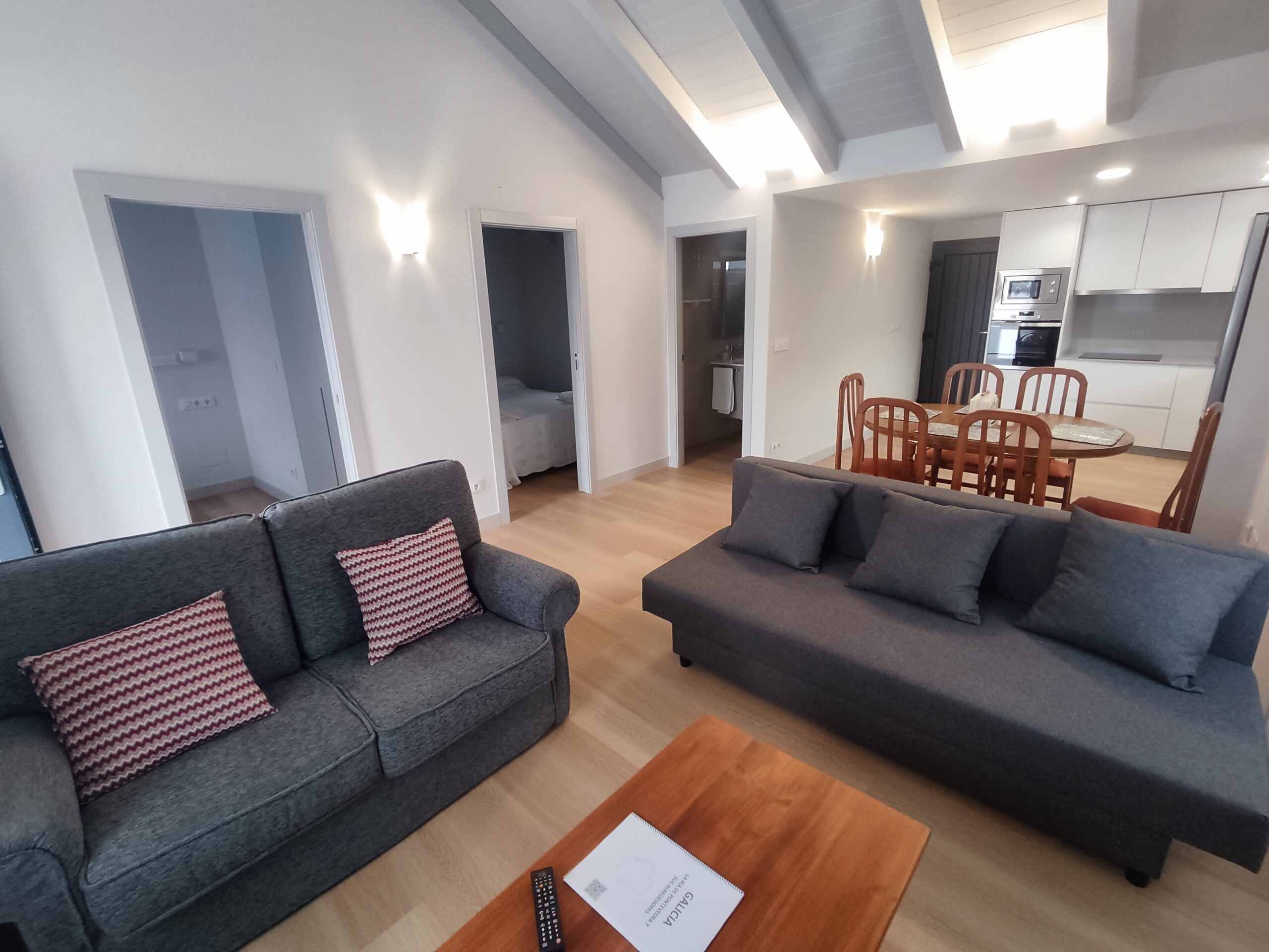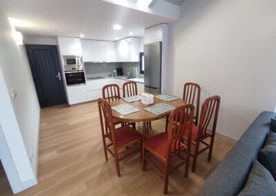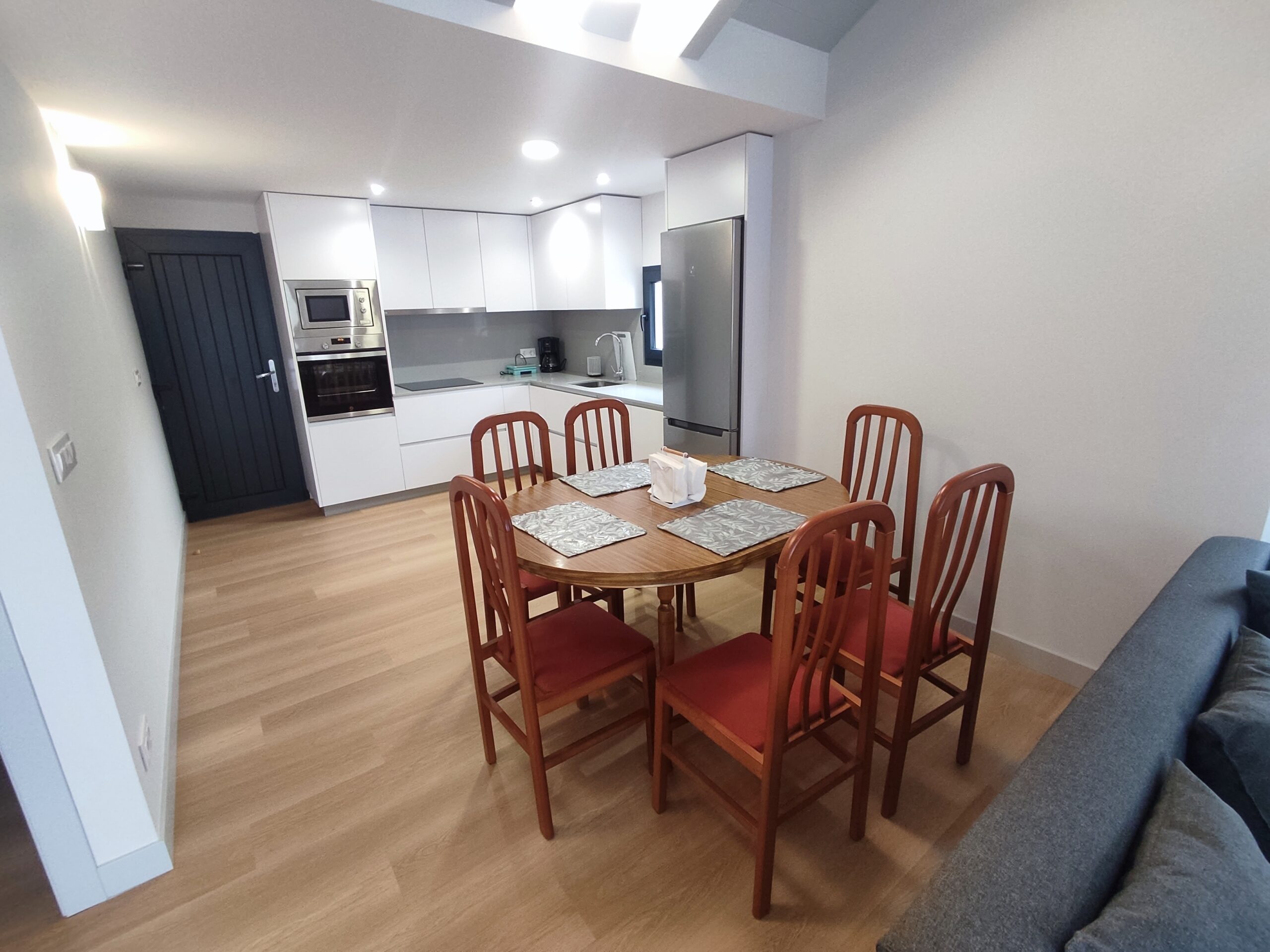 La cocina totalmente está equipada. Placa de inducción, horno, microondas, nevera, etc. Justo al lado de esta cocina se encuentra la zona de comedor y a continuación la zona de salón, con 2 sofá y smart TV. Dado el entorno rural, hay WIFI, pero es por radio, por lo que no tiene la misma calidad que en la ciudad.