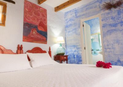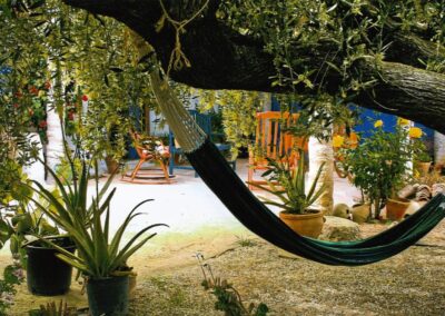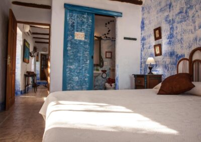 Casa Añil es la casa, que da la bienvenida al complejo, está situada cerca de la entrada, lo que facilita el acceso. Su bonito porche sombreado, adornado con hamacas y tumbonas, es ideal para disfrutar de las mañanas al aire libre. La vivienda está adaptada para personas con movilidad reducida, con una habitación de matrimonio con baño propio accesible en silla de ruedas. Además, tiene capacidad para 6 personas, distribuidas en 3 habitaciones, cada una con 2 camas de 90, y cuenta con 2 cuartos de baño. El interior, que incluye una amplia cocina y un patio interior lleno de buganvillas, ofrece un ambiente espacioso y acogedor, siendo una de las casas más grandes junto con Casa Abuela.
