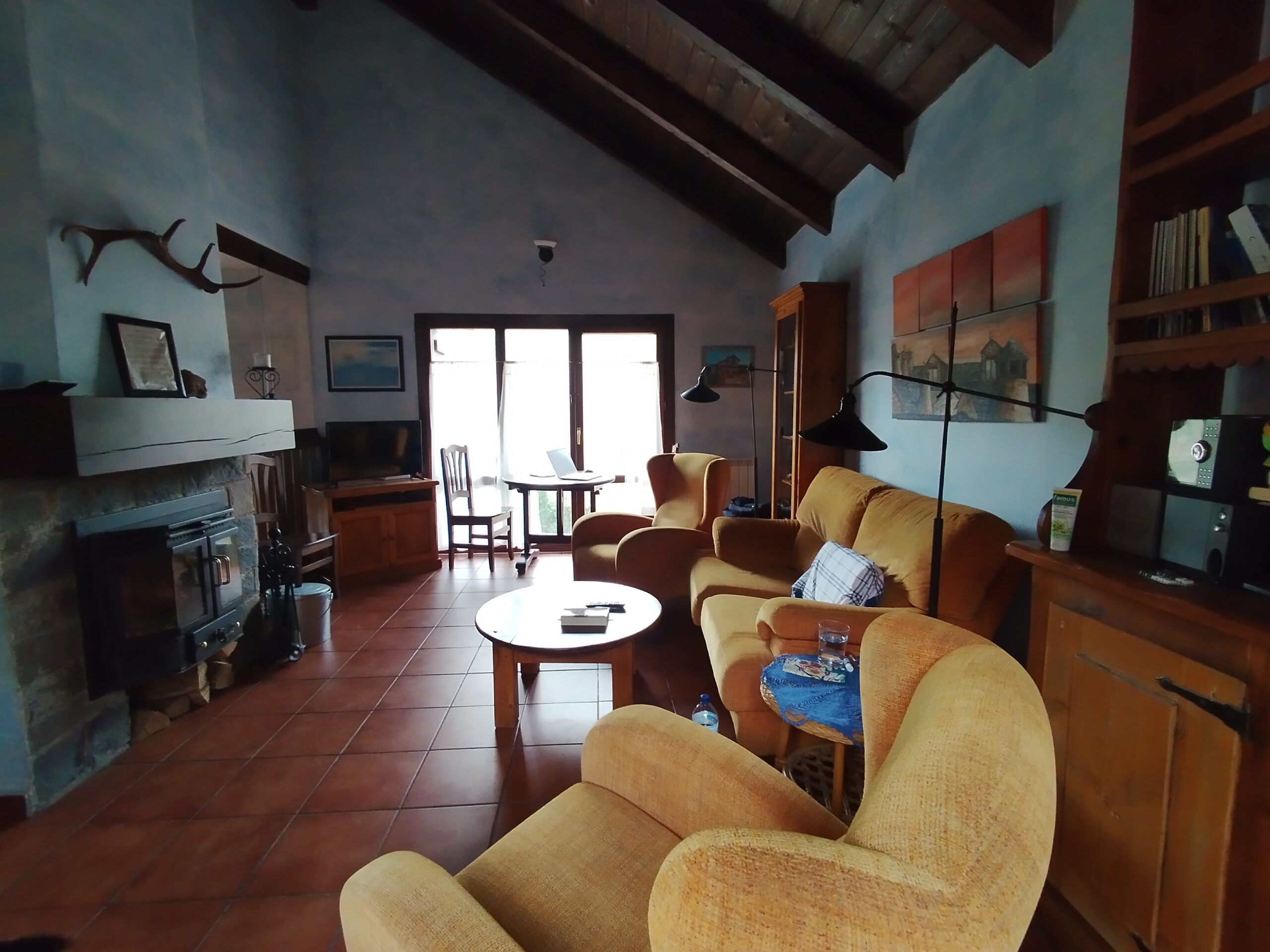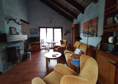 En la planta baja, un espacioso salón con un gran ventanal y una acogedora zona de descanso con sofá y dos butacones invitan a relajarse junto a la chimenea de piedra que preside la estancia. La decoración rústica, con elementos tradicionales, añade un toque de autenticidad y calidez.