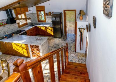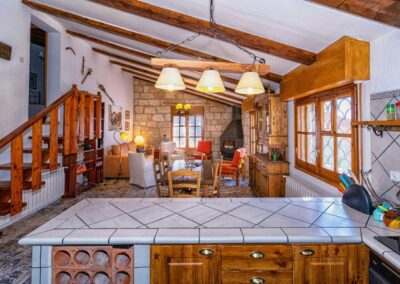 Construida en piedra natural, esta casa cuenta con dos plantas habitables y un almacén/sala de baterías. En la primera planta, se encuentra una cocina completamente equipada con fogones y horno a gas, así como un amplio frigorífico combi. Adyacente a la cocina, está el acogedor salón-comedor con una gran mesa, un cómodo sofá cama doble y varios sillones. Además, una encantadora chimenea añade calidez durante los meses de otoño e invierno. Desde esta planta, se accede a dos terrazas, una principal y otra secundaria, ambas ofreciendo impresionantes vistas al lago.