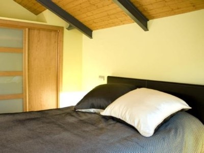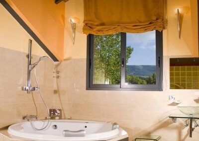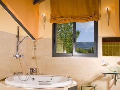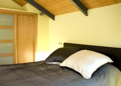 En la planta superior encontraremos los 3 dormitorios. El dormitorio principal es una habitación abuhardillada equipada con jacuzzi para dos personas junto a la cama, un baño completo, vestidor y terraza, además de TV con conexión vía satélite, una gran cama de matrimonio y unas vistas inmejorables de toda la sierra de Guadarrama.