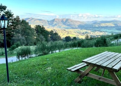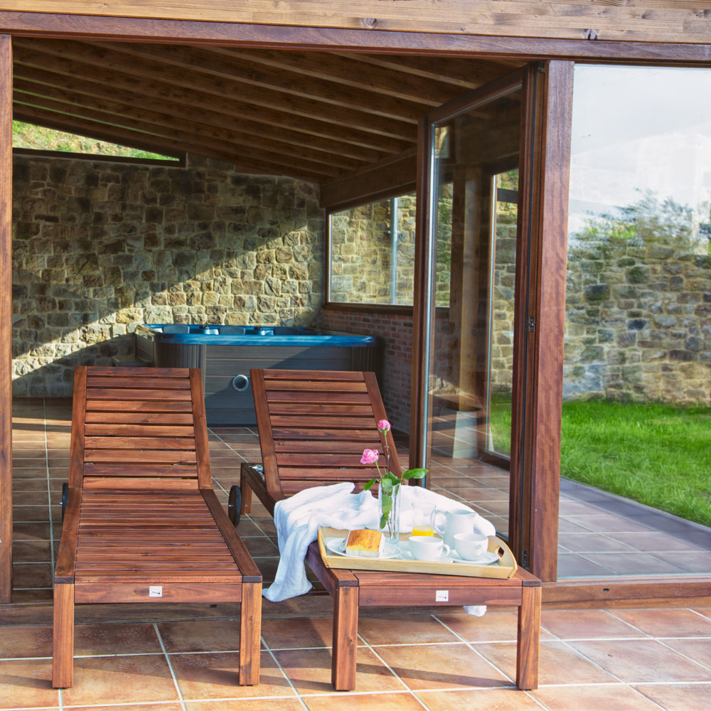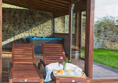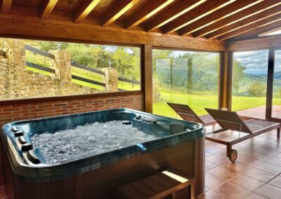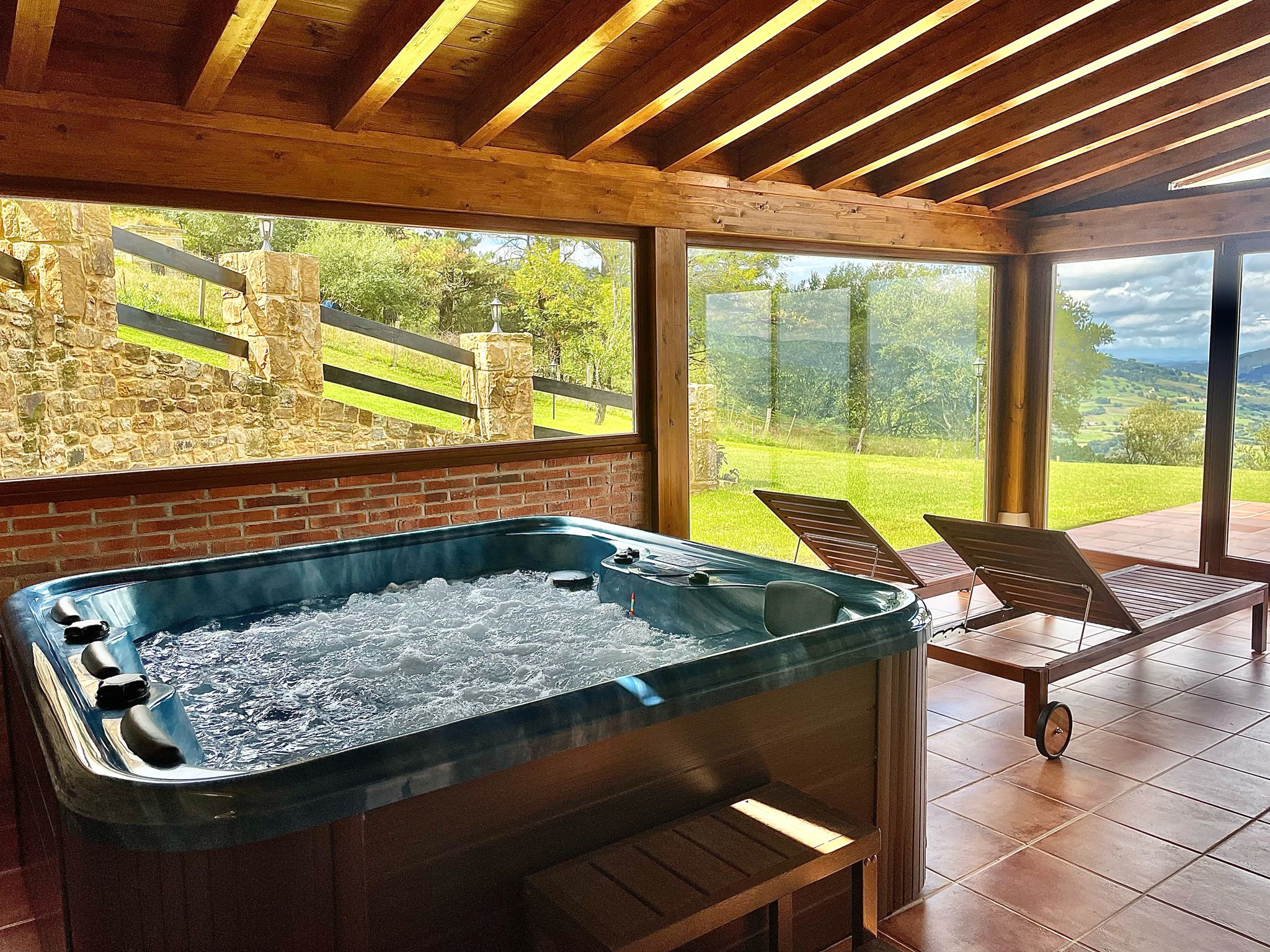 Para una experiencia verdaderamente única, relájate en el exclusivo jacuzzi climatizado, con capacidad para cuatro personas, mientras admiras las impresionantes vistas del valle del Pisueña.