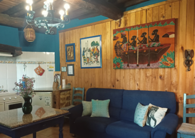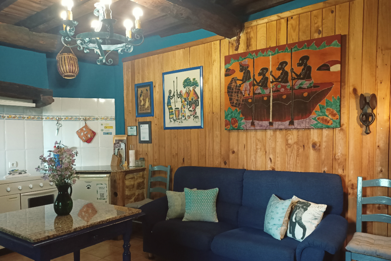 La superficie de la casa consta de 80 m2 distribuidos en dos plantas. Está decorada en tonos azules y en sus paredes cuelgan diferentes batiks y telas étnicas traídas de Malí y Camerún.