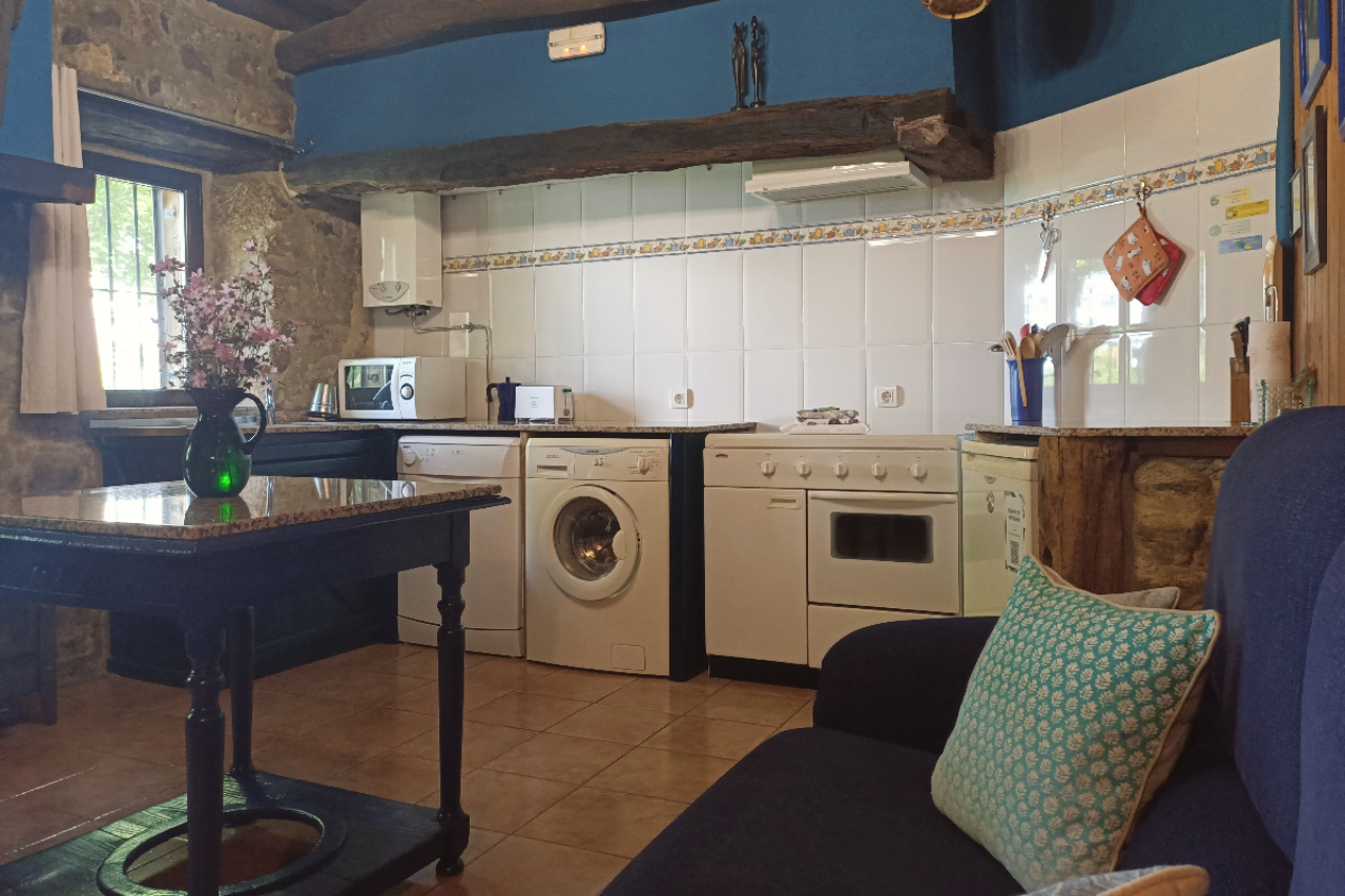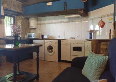 En la planta de abajo encontramos la cocina completa, totalmente equipada con el menaje y los electrodomésticos (cocina con horno de gas, microondas, lavavajillas, lavadora, cafetera italiana, tostador, batidora, y exprimidor etc.) necesarios para poder disfrutar durante toda la estancia. Junto a la cocina encontramos un pequeño salón con sofá, televisión HD con entradas HDMI y DVD. Además, ponemos a disposición wifi gratuito por satélite.