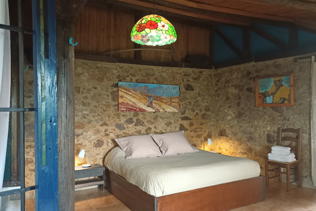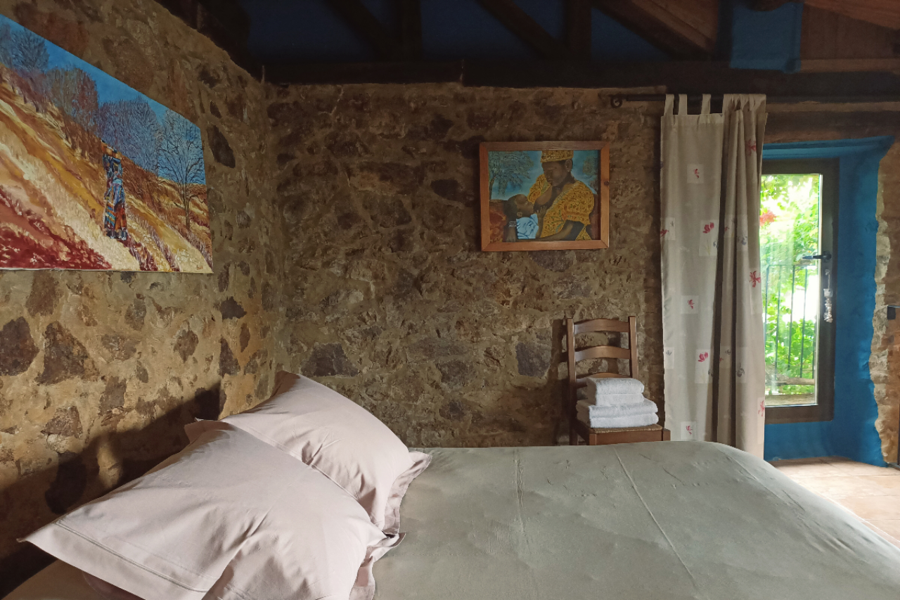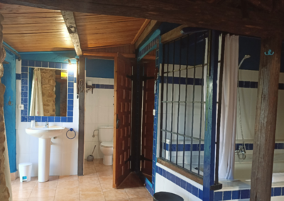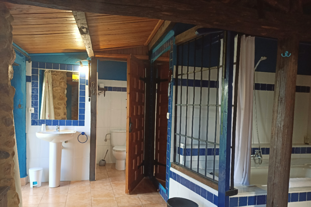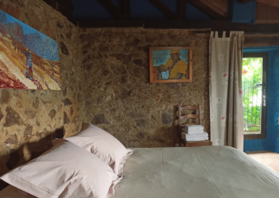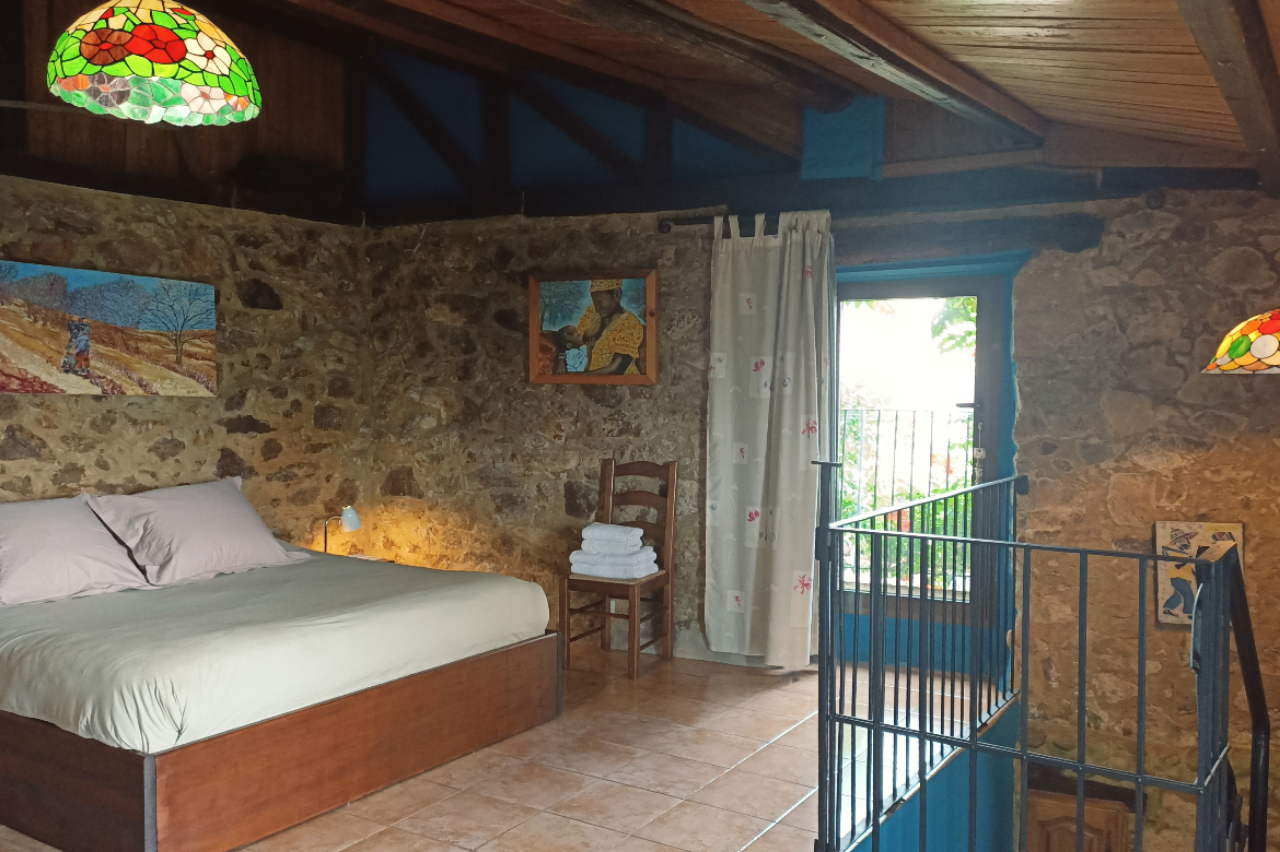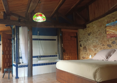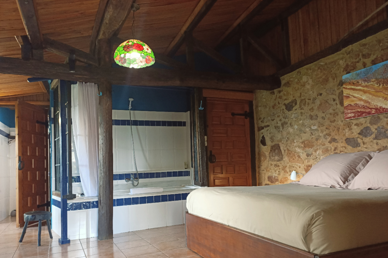 Se encuentra la luminosa habitación con una cama de 160cm, con ropa de cama 100% algodón y el baño integrado con bañera grande, perfecta para esa escapada de relax-romántico. Una de las tres ventanas que posee la habitación tiene un pequeño balcón desde el que podemos contemplar bonitas vistas a la montaña. Desde las otras dos ventanas observamos el horizonte y al fondo el pantano de Gabriel y Galán