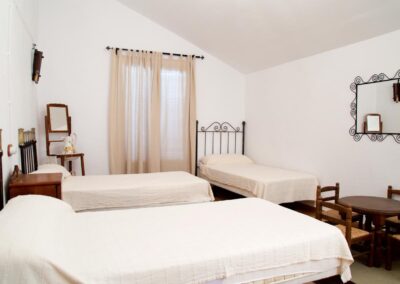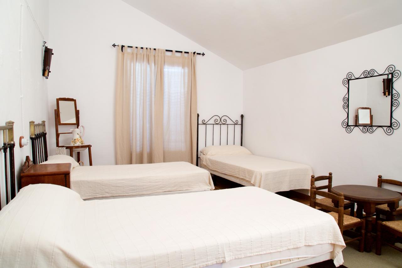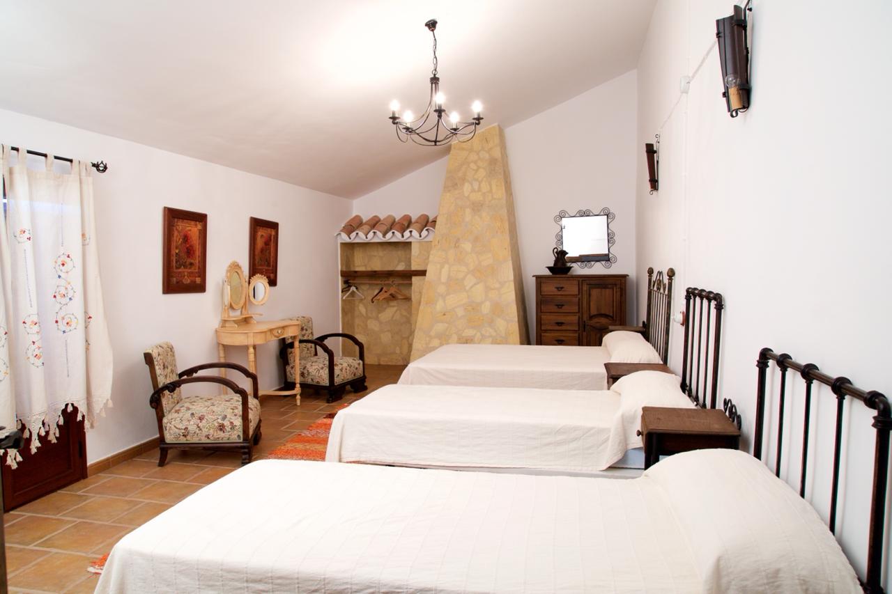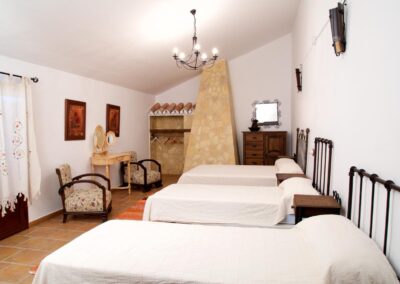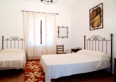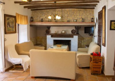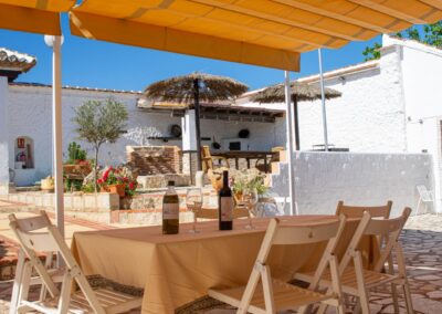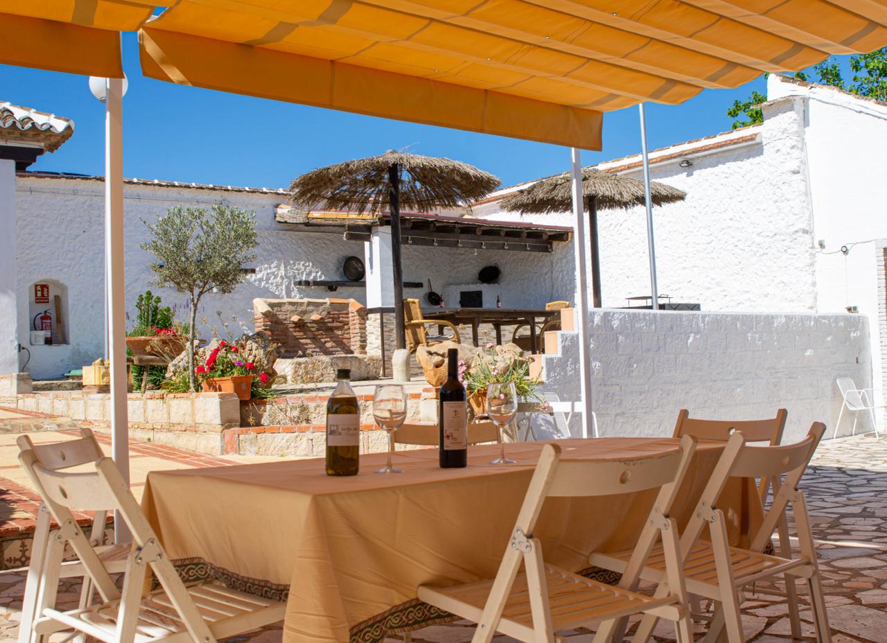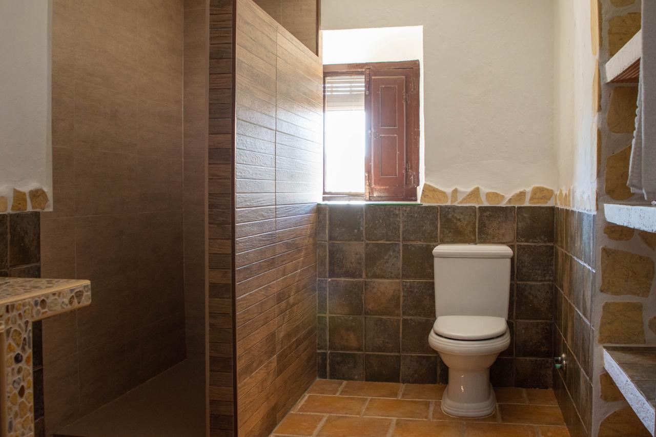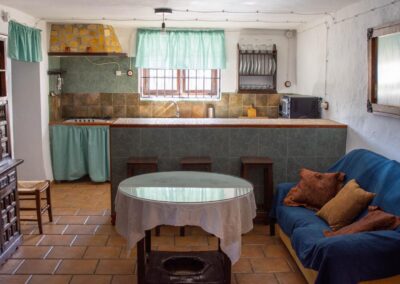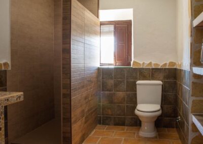 El cortijo ofrece amplios espacios interiores, incluyendo una cocina-comedor totalmente equipada, un salón espacioso con chimenea, seis habitaciones de generosas dimensiones con capacidad para 16 personas, una despensa, terraza, porche, dos cuartos de baño interiores y un lavadero. Además, cuenta con dos televisores en el salón y el comedor, y conexión Wi-Fi para mantenerte conectado.