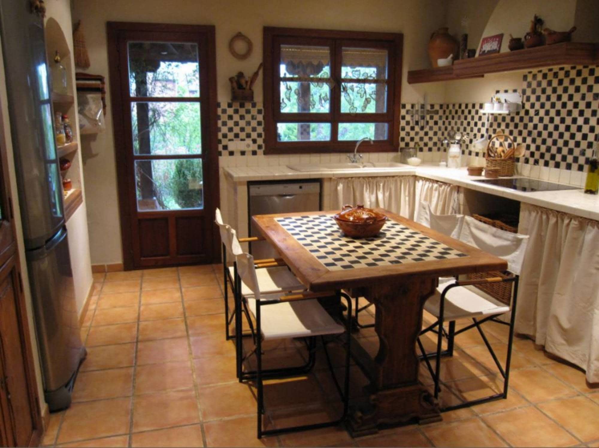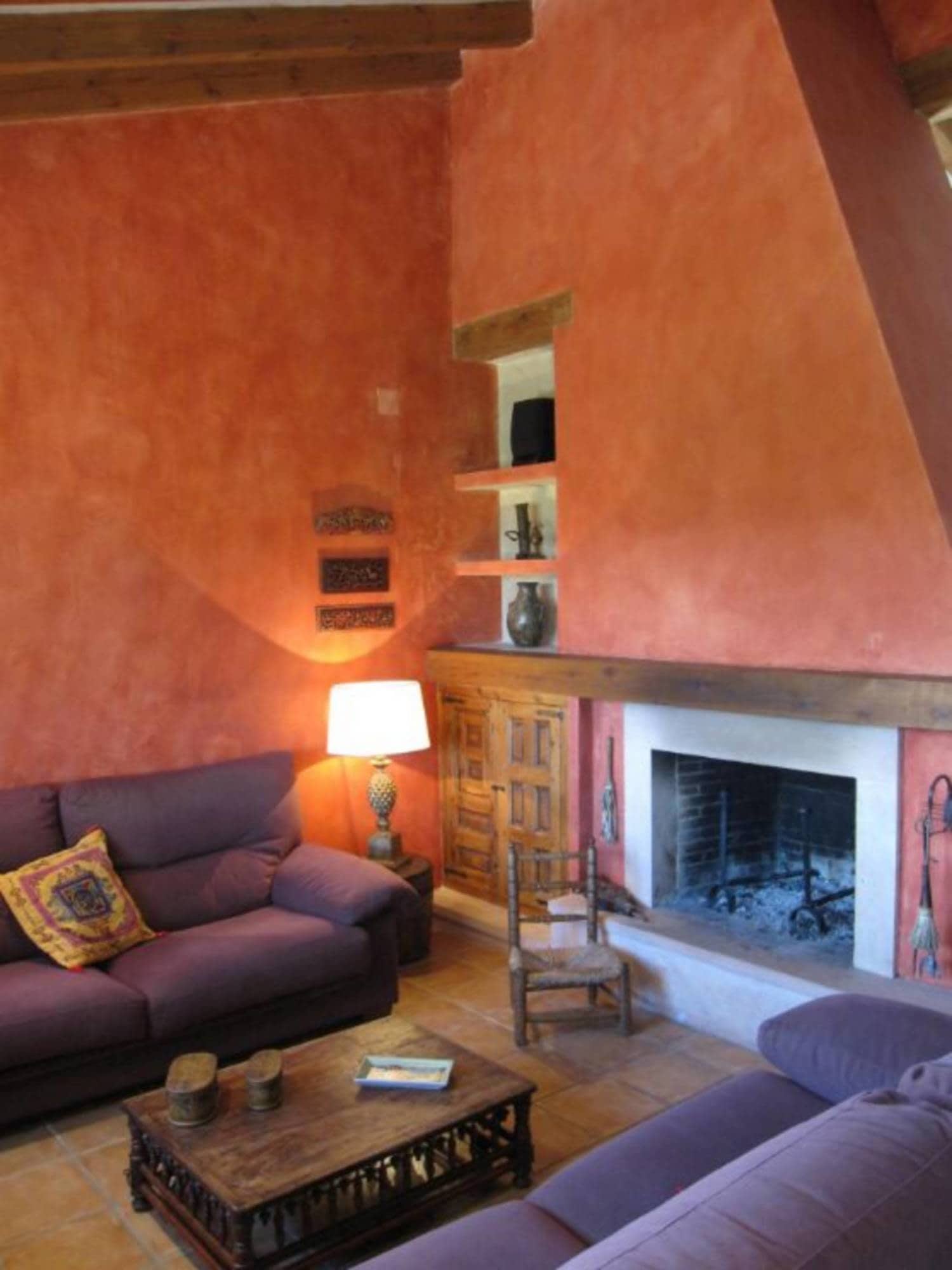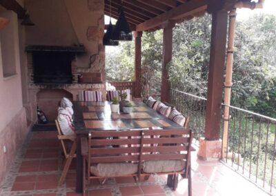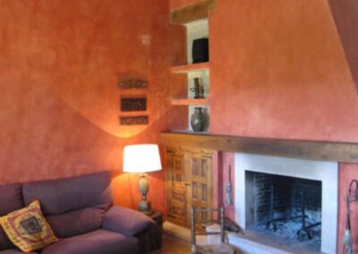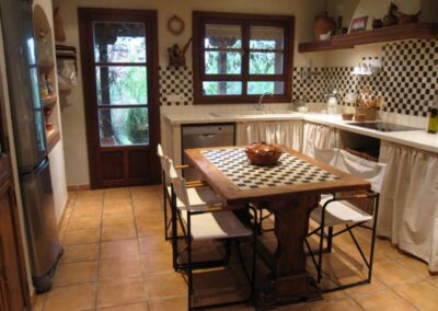 Su gran salón tiene dos zonas separadas por una gran chimenea con cómodos sofás para descansar viendo el fuego y una gran mesa de madera para 12 personas en un espacio con grandes ventanas al jardín. La cocina está decorada con muebles rústicos de obra, alacena antigua y hornacina y tiene todas las comodidades, horno, lavavajillas, nevera y microondas, y un completo equipamiento de menaje. En el salón de juegos hay biblioteca, juguetes y libros infantiles, y una gran selección de juegos de mesa.