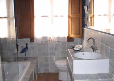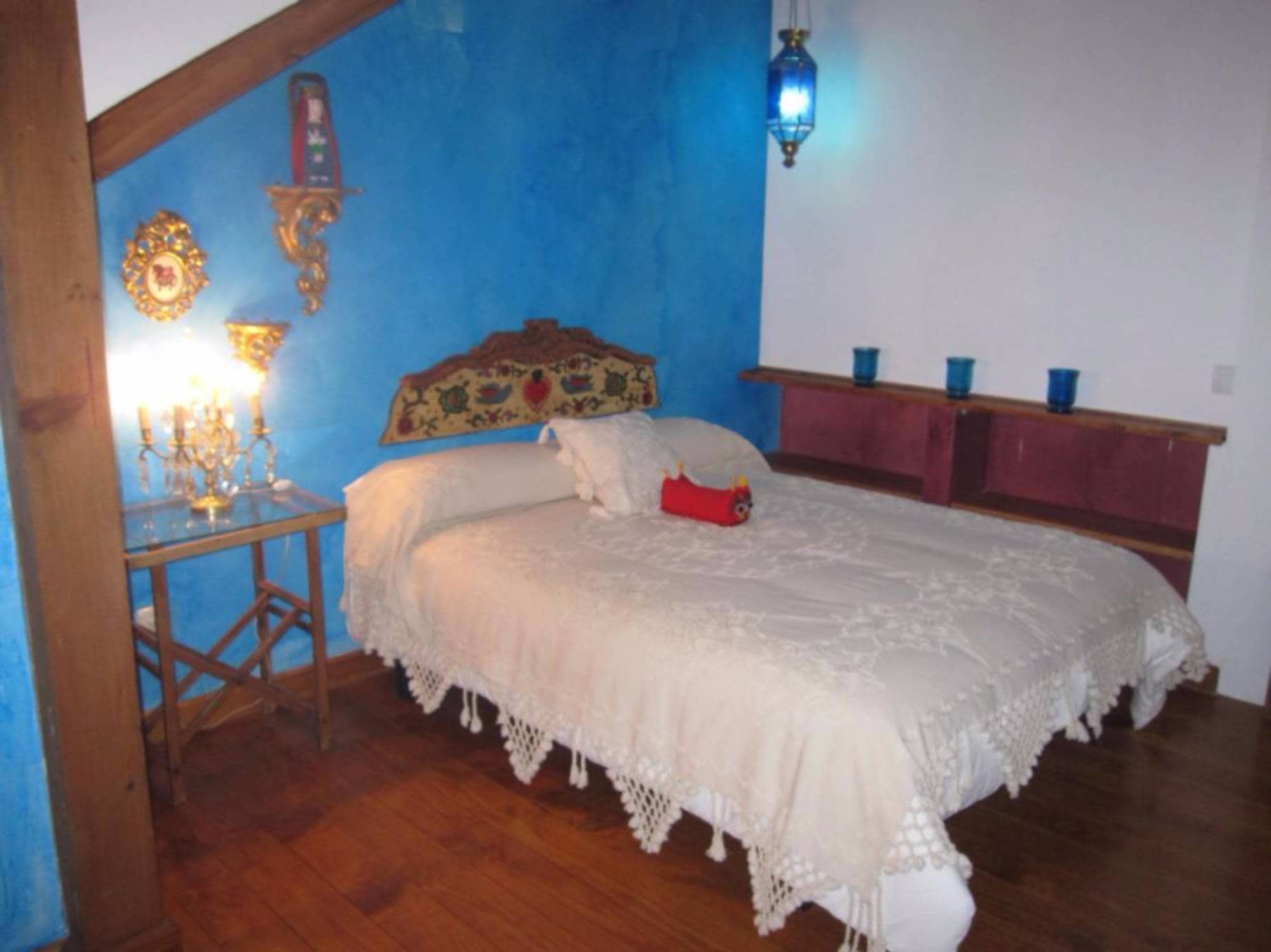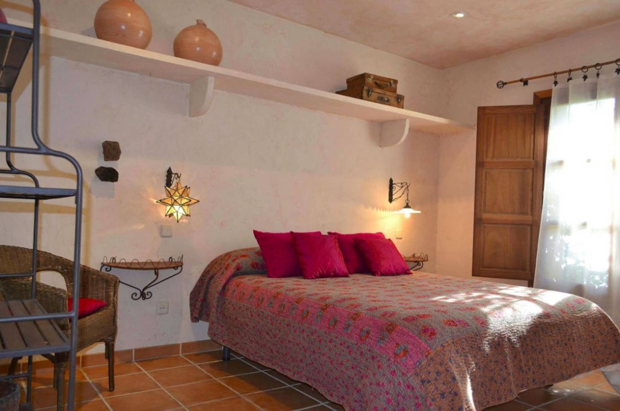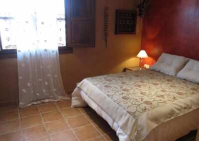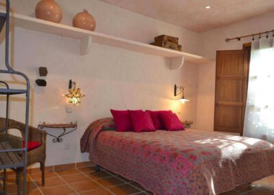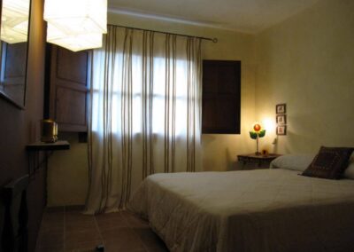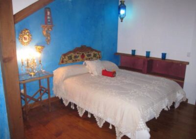 Cada dormitorio tiene elementos que lo hacen único, vigas de madera, techos abuhardillados, paredes de colores, colchas de ganchillo, o sillas, mesillas y espejos restaurados por mí. Creando una cálida sensación, propia de una casa habitada.