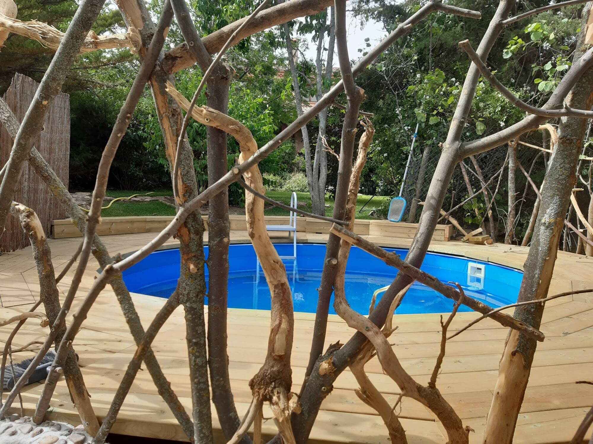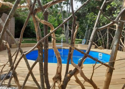 La piscina aparece en medio de la vegetación, rodeada de tarima de madera natural y con una valla artística de troncos. Hay diferentes rincones con césped y mobiliario, para que disfrutes del jardín al sol o a la sombra de grandes árboles.