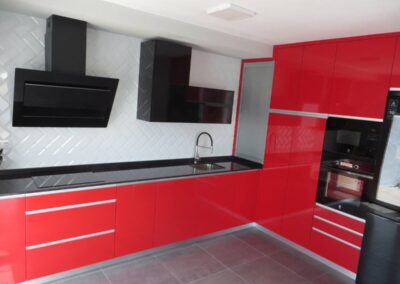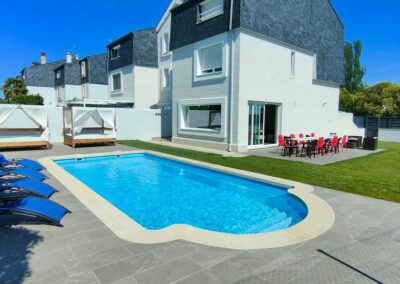 La cocina, con su impactante diseño en tonos rojos y electrodomésticos de cristal negro, es un espacio que invita a disfrutar de la gastronomía con estilo y funcionalidad. La casa dispone de 8 habitaciones decoradas con gusto, con capacidad para alojar a 24 personas, y 4 baños modernos que aseguran comodidad para todos. Además, dispone de conexión WiFi para que te mantengas conectado mientras disfrutas de esta experiencia única.
