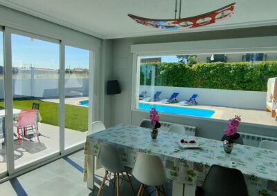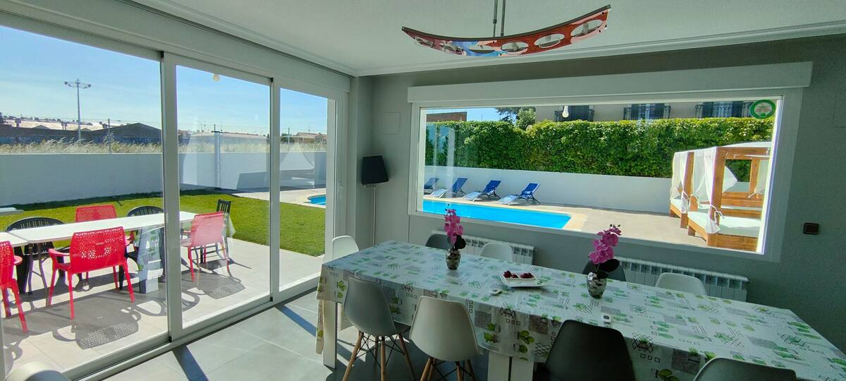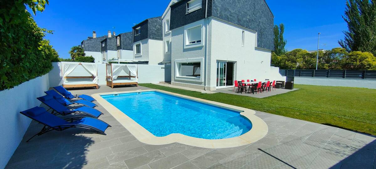 Edén de Salamanca es una villa de ensueño que combina lujo, confort y diseño en un espacio único y exclusivo. Reformada para ofrecer la mejor experiencia a sus huéspedes, esta impresionante vivienda es perfecta para grandes reuniones familiares, escapadas con amigos o celebraciones especiales. Su interior destaca por un salón amplio y lleno de luz, equipado con cómodos sofás y un comedor de diseño con dos grandes mesas ideales para compartir momentos inolvidables.