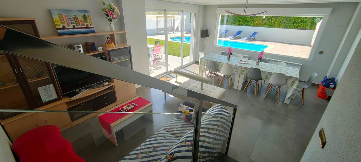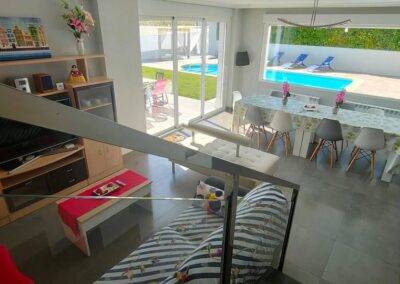 La villa está distribuida en varias plantas conectadas por una preciosa escalera de pizarra negra con barandilla de acero inoxidable y cristal, un detalle que realza el diseño sofisticado de la vivienda. Los grandes ventanales inundan las estancias de luz natural, mientras que la decoración de alto standing aporta un ambiente moderno y cálido que te hará sentir como en casa.