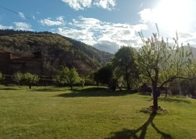 Dispone de un jardín de 5.000 m² rodeados de un muro de piedra y dos entradas, una para vehículos (se puede aparcar dentro, parking privado) y otra para peatones.