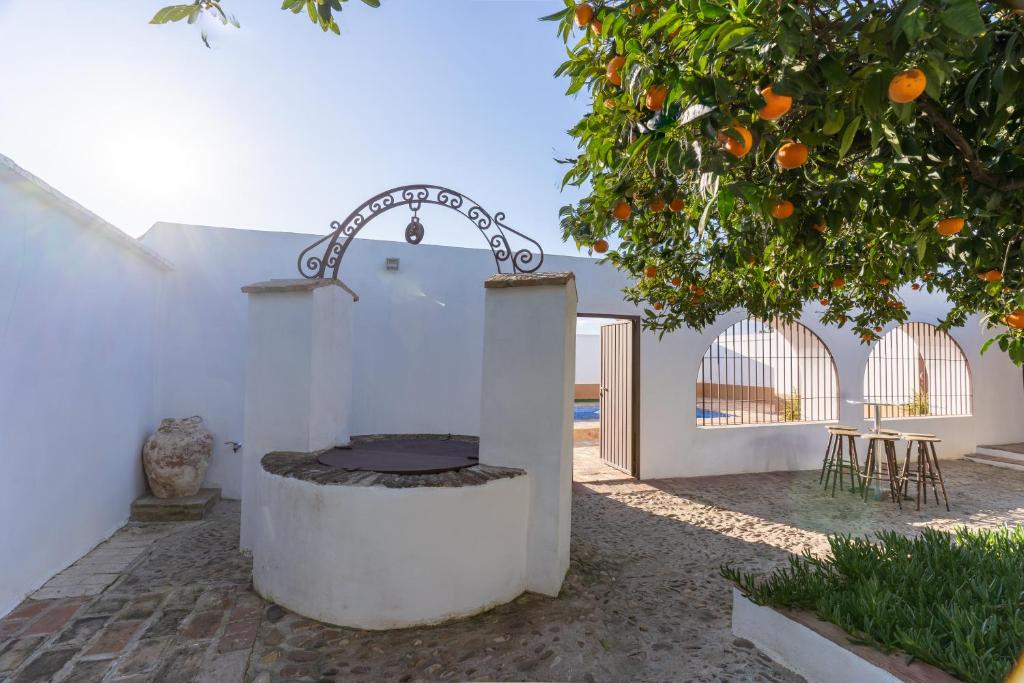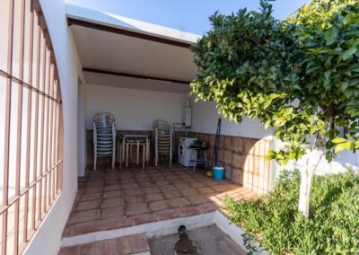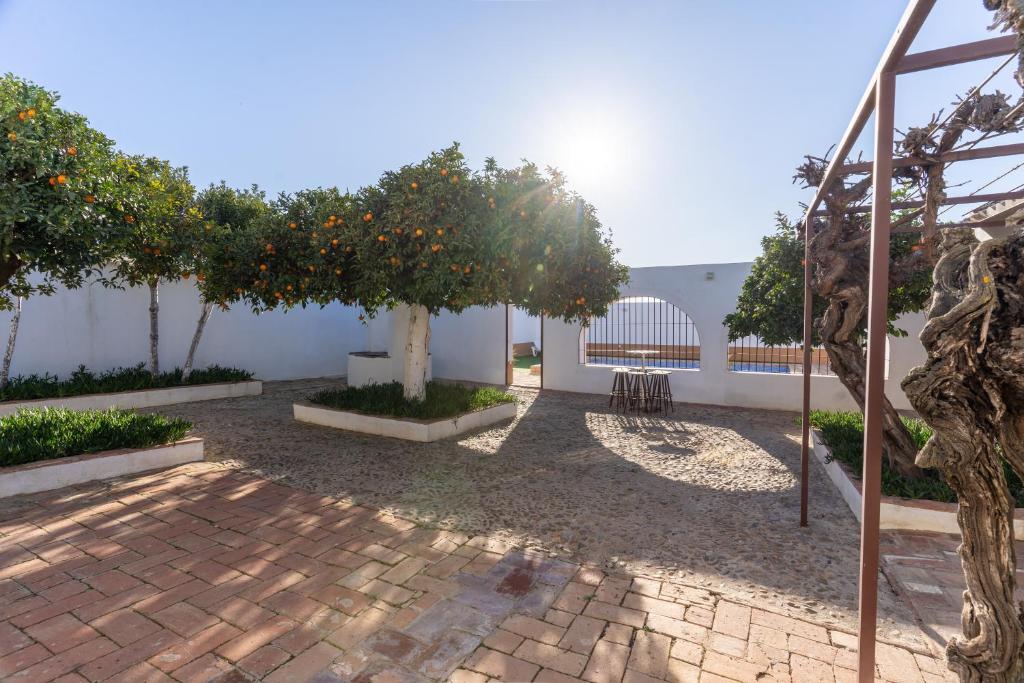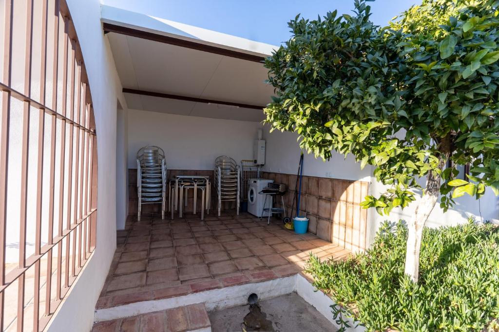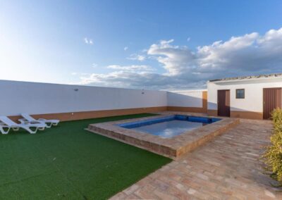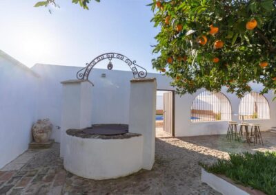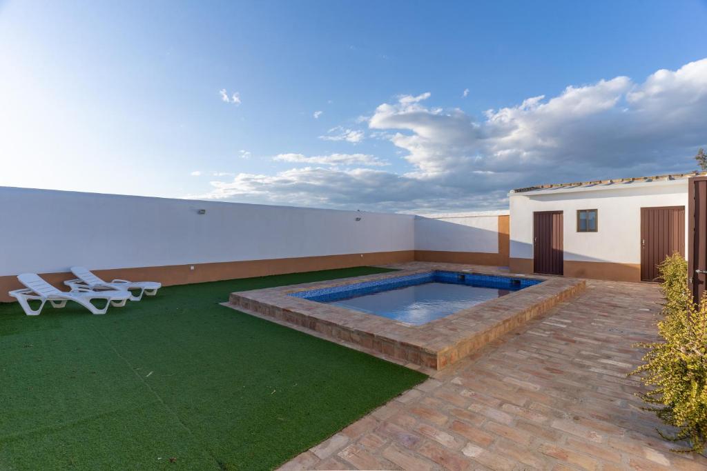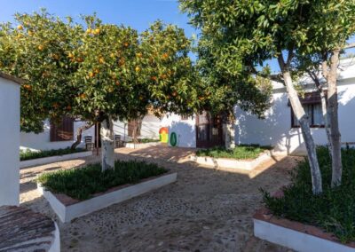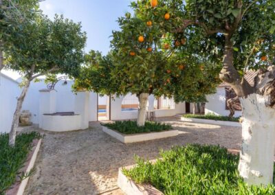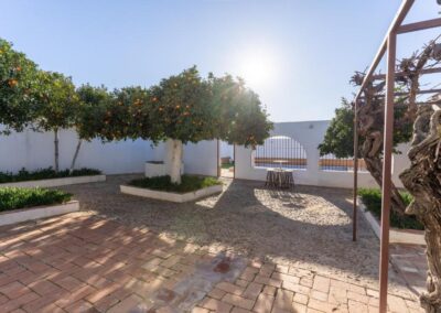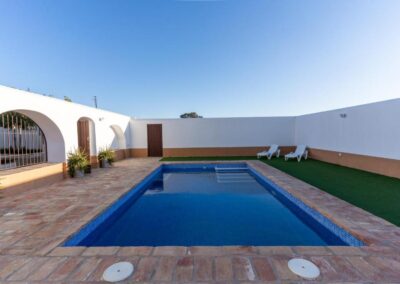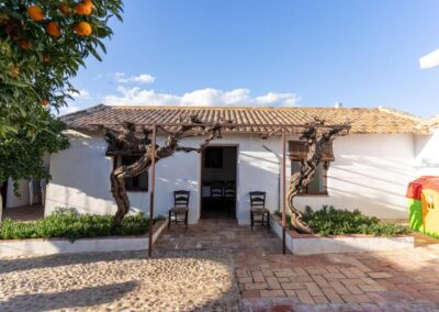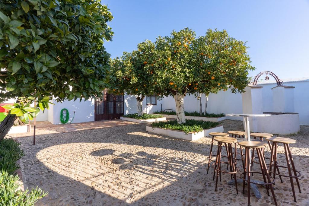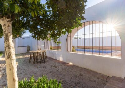 El exterior de El Nogal es un auténtico oasis de tranquilidad. Su piscina privada, completamente vallada para mayor seguridad, invita a refrescarse bajo el sol andaluz, mientras que las dos terrazas ofrecen el espacio perfecto para relajarse o disfrutar de una cena al aire libre. La zona de barbacoa equipada con rosco paellero y botellero promete veladas inolvidables, rodeadas del aroma de los naranjos y parras antiguos del amplio patio tradicional, cuyos frutos pueden degustarse durante la estancia.