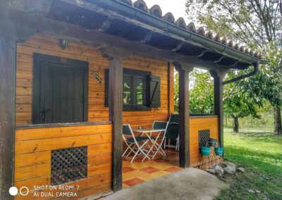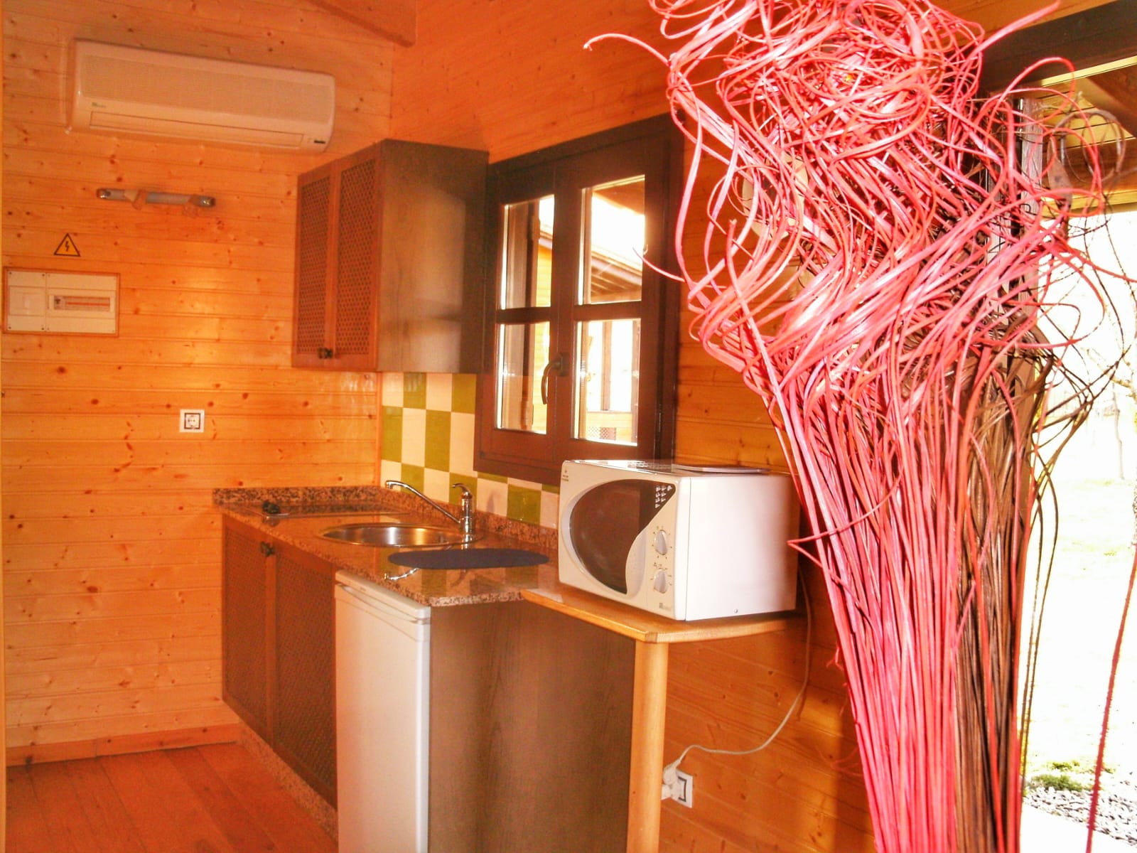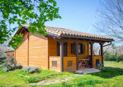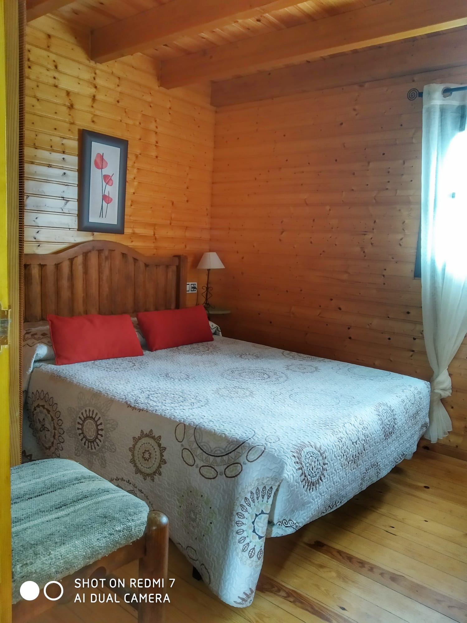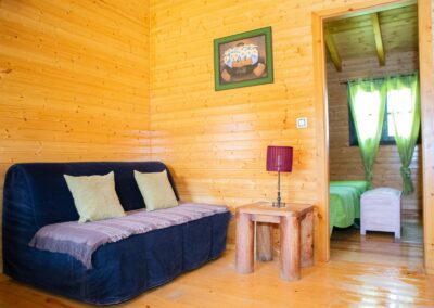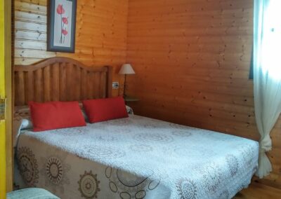 2 cabañas para 6 personas (65 m², en dos plantas); cada una con tres dormitorios dobles (uno con cama de matrimonio y los otros dos, en la planta de arriba, con dos camas cada uno), salón-cocina, cuarto de baño y porche exterior.