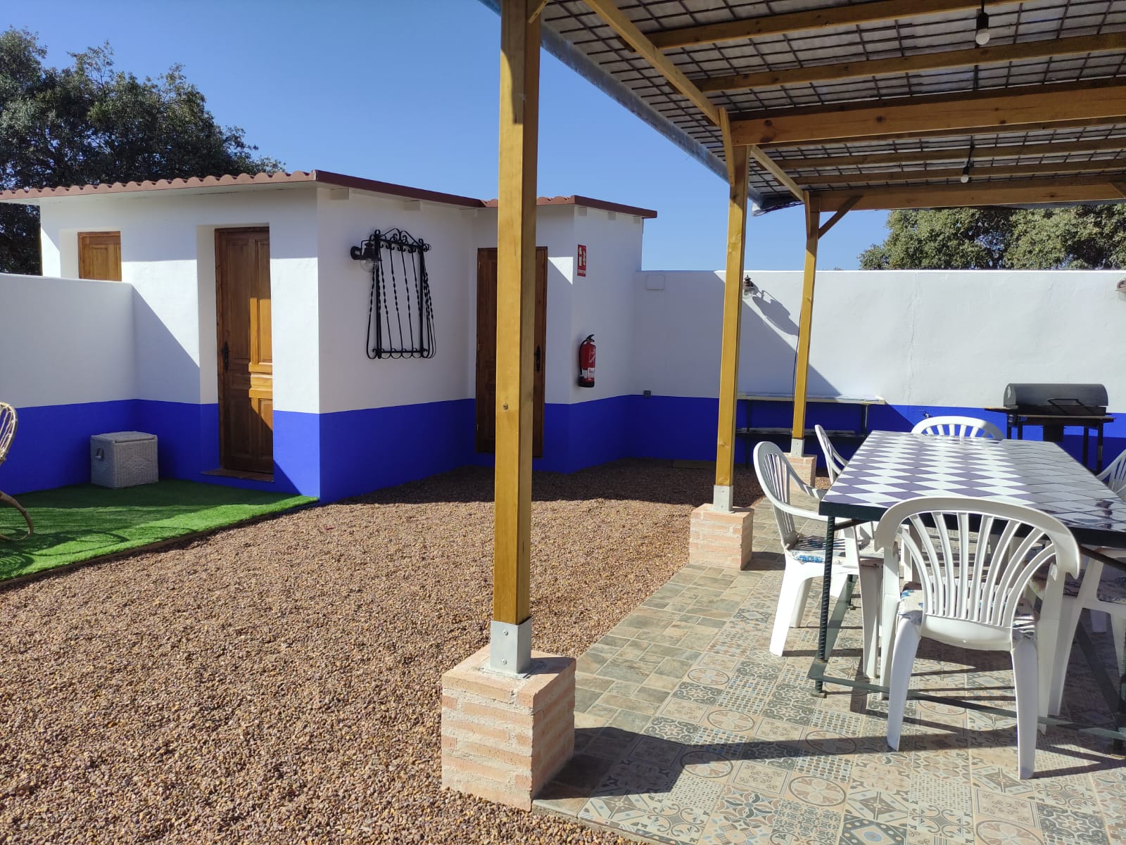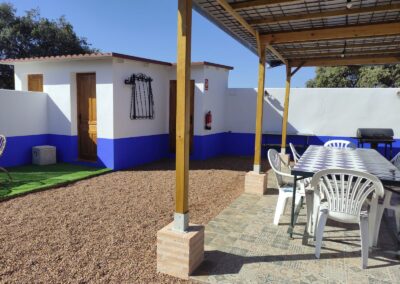 La casa tiene dos dormitorios y un acogedor porche y patio con solarium, piscina de sal, barbacoa y sauna