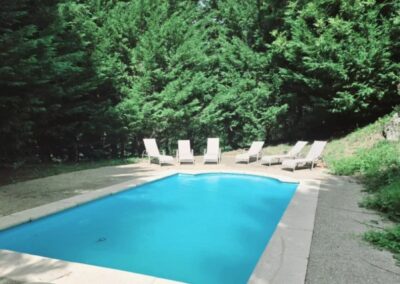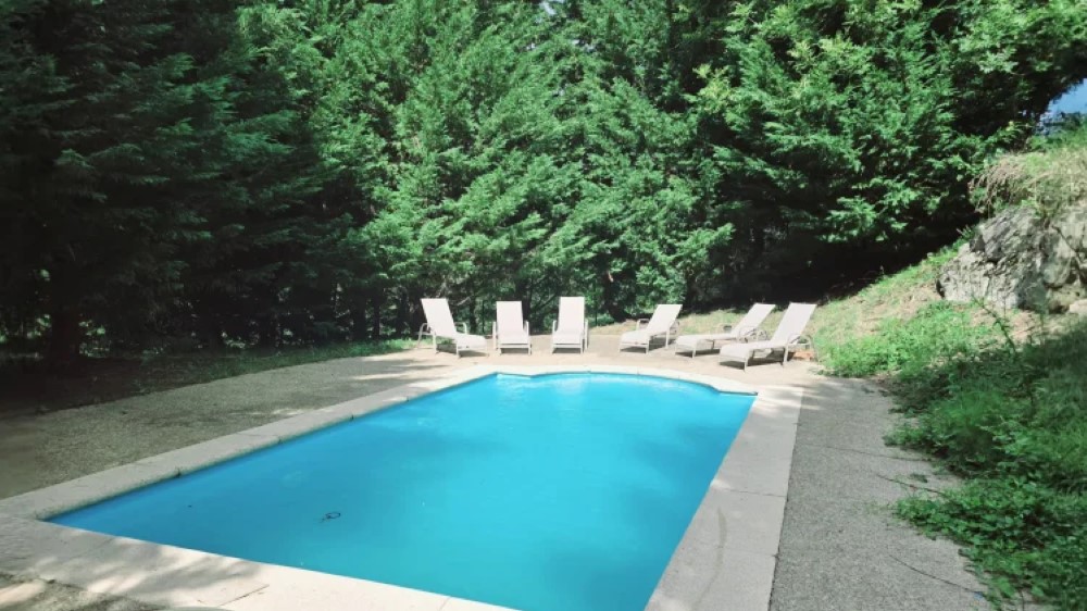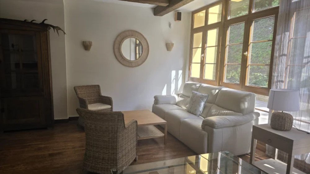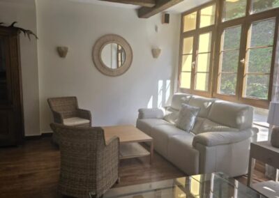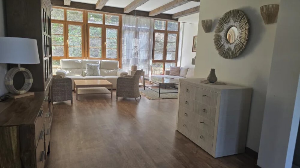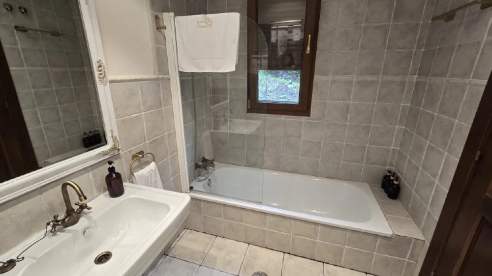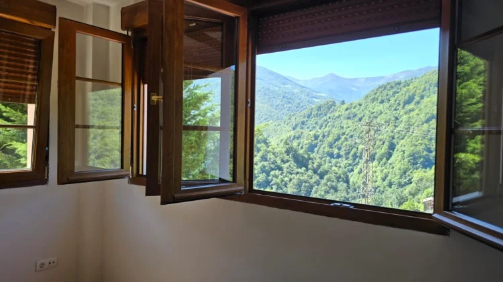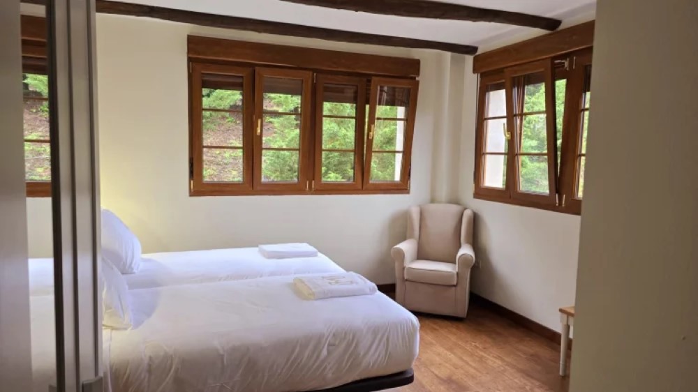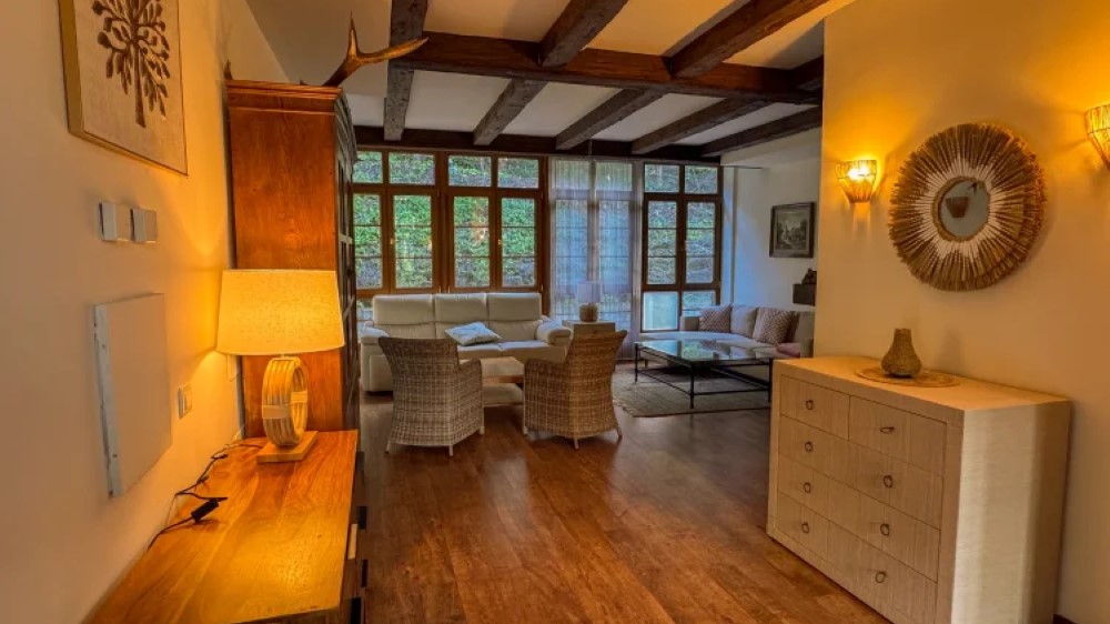 El entorno exterior es uno de sus mayores atractivos. Cuenta con una amplia zona ajardinada, terraza, aparcamiento privado gratuito y un entorno natural donde respirar aire puro. Dispone de piscina, su localización privilegiada junto al río y el paisaje montañoso lo convierten en un auténtico paraíso natural.