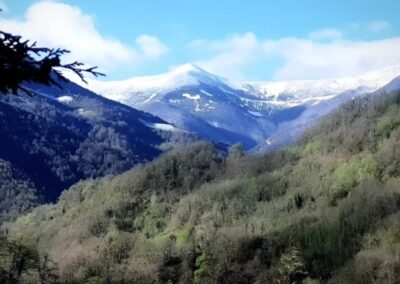 Santibáñez de Murias está rodeado de paisajes de alta montaña, ríos cristalinos y bosques de robles y castaños. El entorno forma parte del Parque Natural de las Ubiñas-La Mesa, declarado Reserva de la Biosfera, lo que garantiza un entorno cuidado, rico en biodiversidad y perfecto para practicar turismo responsable. Es un lugar donde el silencio solo se rompe con el canto de los pájaros o el murmullo del agua, y donde tu mascota podrá correr libremente por senderos seguros y poco transitados.