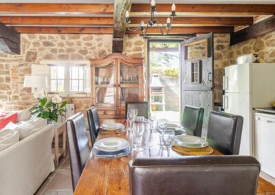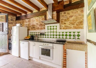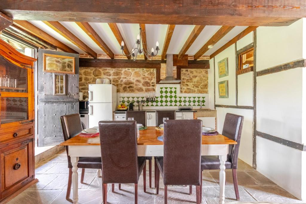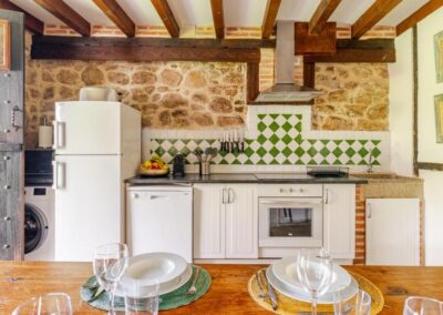 La casa tiene capacidad para 7 personas distribuidas en 120 metros cuadrados, en los que se combinan espacios acogedores y funcionales. La cocina-comedor está totalmente equipada con electrodomésticos y menaje completo, permitiendo preparar tus platos favoritos, mientras que la mesa de madera invita a compartir comidas en un ambiente cálido y familiar. La sala de estar contigua dispone de sillones confortables, televisión de plasma y una estufa de pellets en el salón-comedor, creando un espacio perfecto para relajarse tras un día de excursiones.