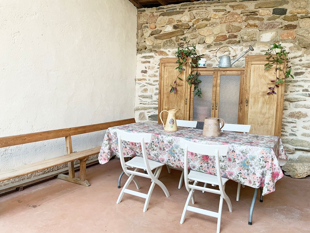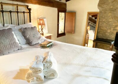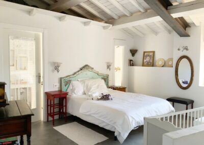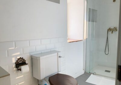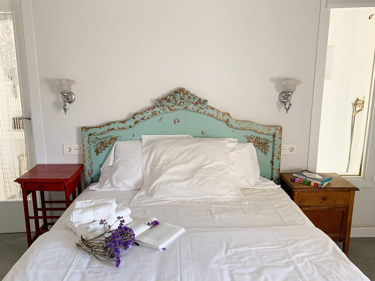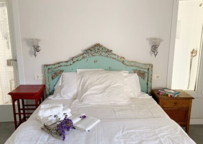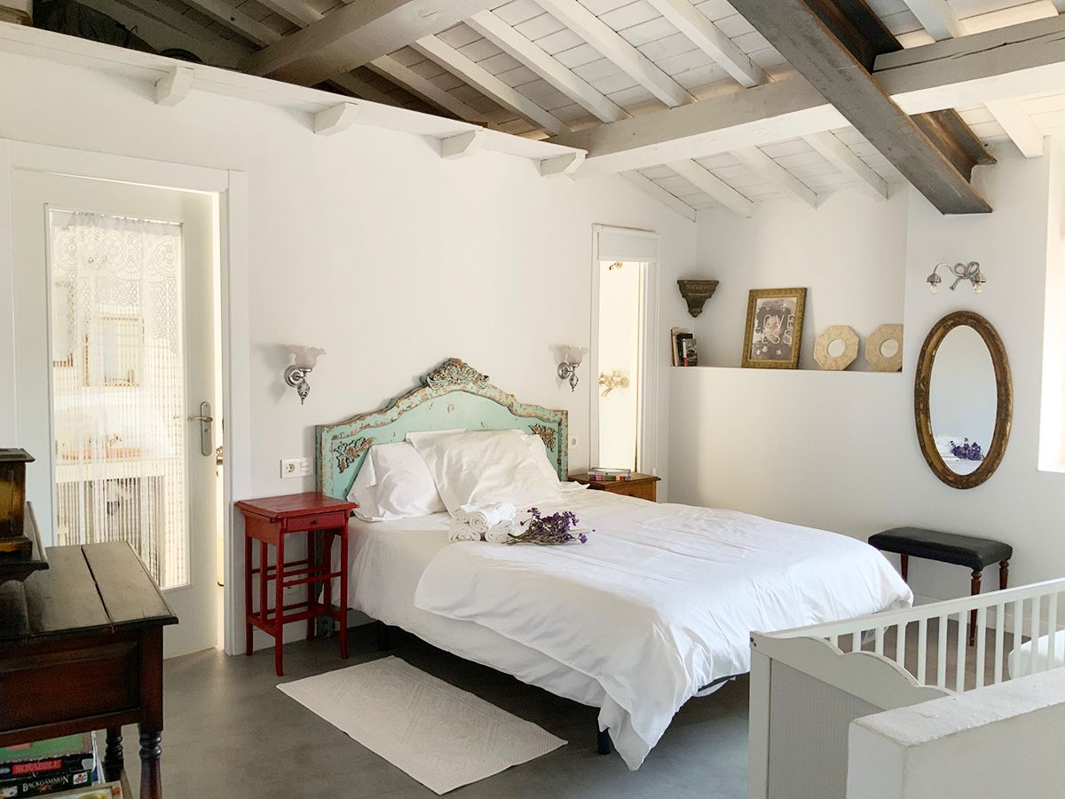 En la planta de arriba, una habitación con techo abuhardillado, ventanas de madera y dispone de aire acondicionado. La cama de hierro es una herencia de mi abuela, cálida y mullida, con mesillas de madera y un escritorio maravillo. El cuarto de ducha es espacioso y tiene una claraboya que le permite tener luz natural durante todo el día. El lavabo verde es de un anticuario y los azulejos de la ducha salen en la película «El cuento de la criada», son preciosos. Pintada en colores grises, blancos, madera teñidas de blanco y nogal y paredes en piedra. Con acceso directo por el patio, el cual es compartido, donde hay unas tumbonas para tomar el sol y poder leer un buen libro, una mesa con sillas para disfrutar de la comida o desayuno. La mitad está tapado con un porche en el cual te puedes proteger mientras llueve o calienta el sol.