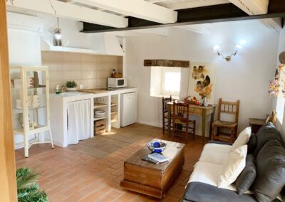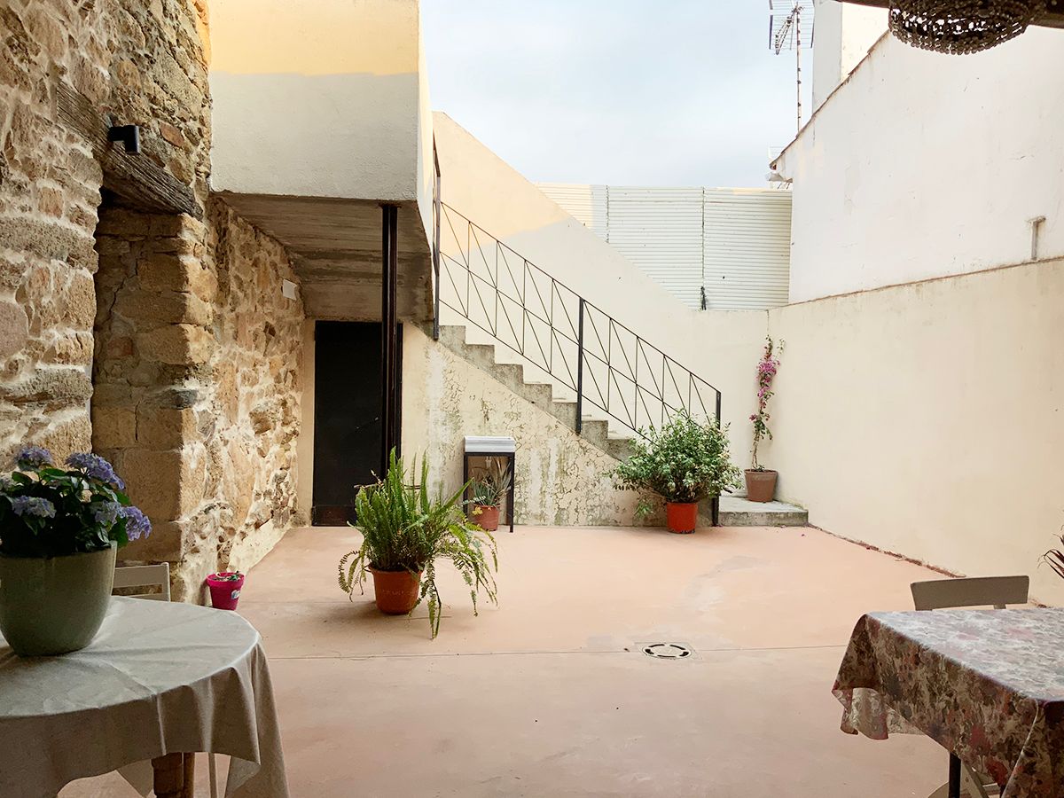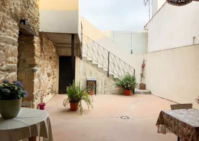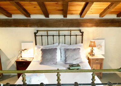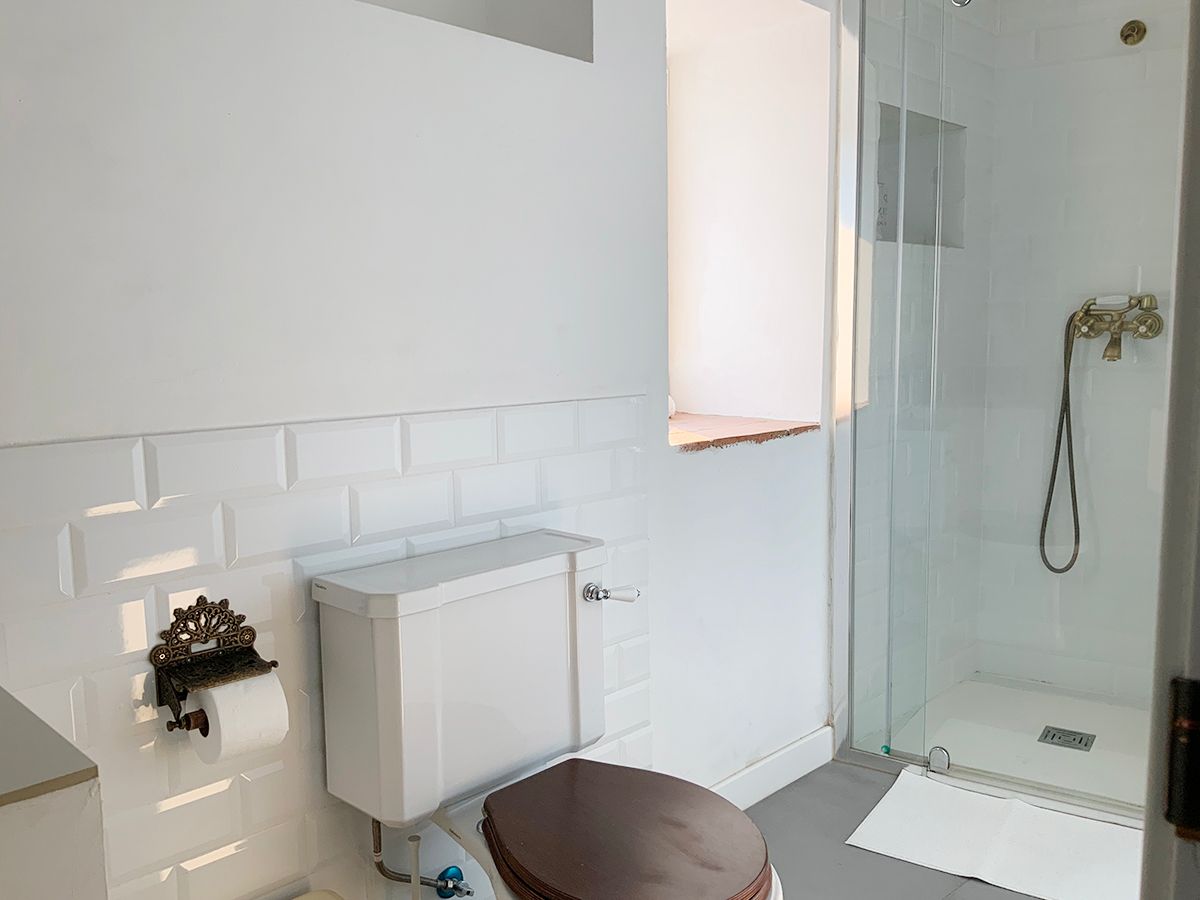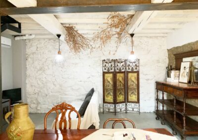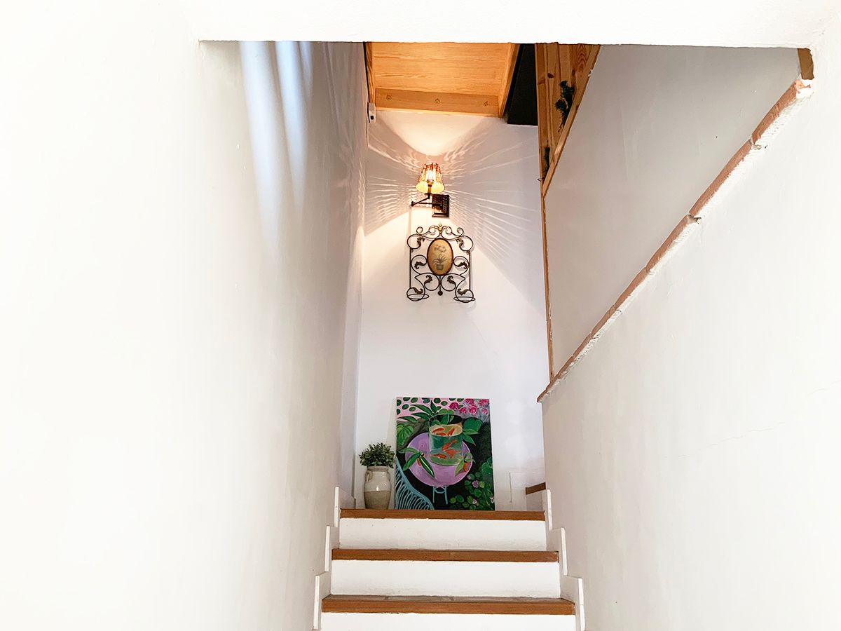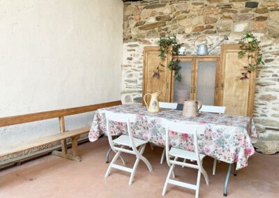En la planta de arriba, una habitación con techo abuhardillado, ventanas de madera y dispone de aire acondicionado. La cama de hierro es una herencia de mi abuela, cálida y mullida, con mesillas de madera y un escritorio maravillo. El cuarto de ducha es espacioso y tiene una claraboya que le permite tener luz natural durante todo el día. El lavabo verde es de un anticuario y los azulejos de la ducha salen en la película «El cuento de la criada», son preciosos. Pintada en colores grises, blancos, madera teñidas de blanco y nogal y paredes en piedra. Con acceso directo por el patio, el cual es compartido, donde hay unas tumbonas para tomar el sol y poder leer un buen libro, una mesa con sillas para disfrutar de la comida o desayuno. La mitad está tapado con un porche en el cual te puedes proteger mientras llueve o calienta el sol.
