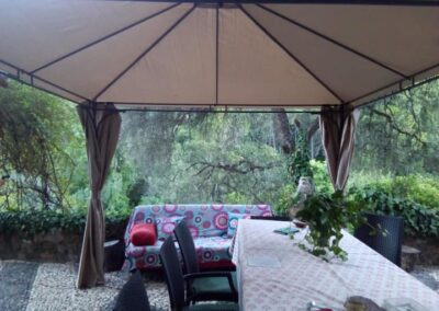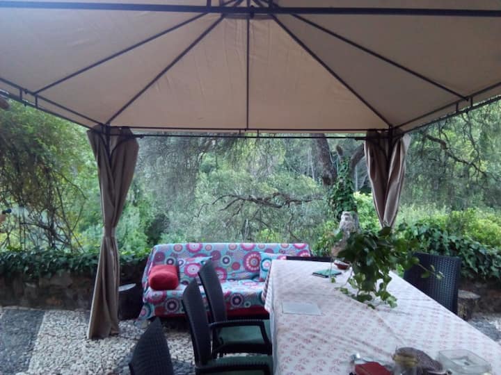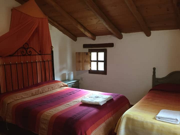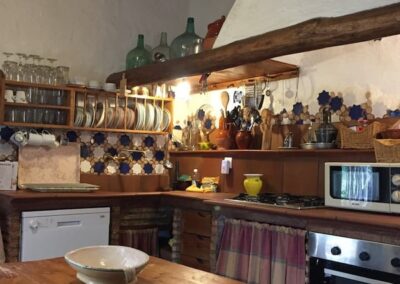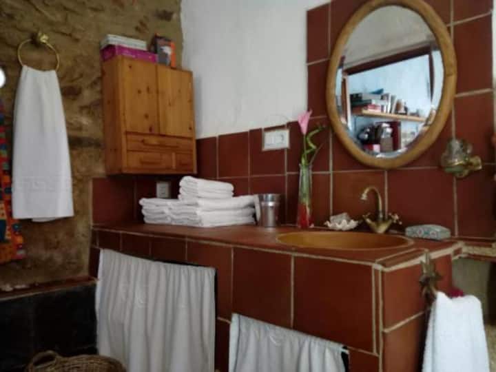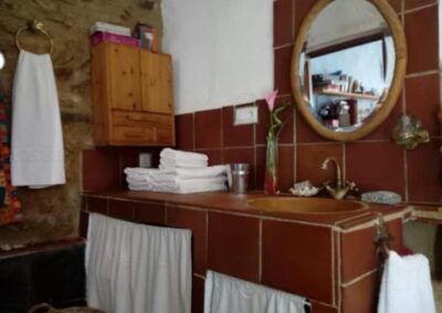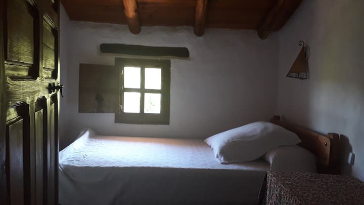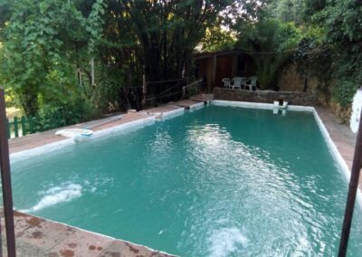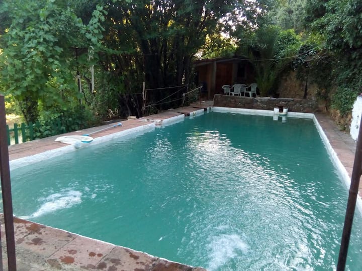 La casa rural cuenta con diferentes terrazas, con preciosas vistas a la montaña y a la piscina. Con capacidad de hasta 8 ó 9 personas. Consta de cuatro dormitorios, sala de estar, cocina totalmente equipada y dos baños. Cuenta con piscina privada, jardín, zona de barbacoa y aparcamiento privado gratuito. Se accede directamente en coche hasta la Finca.